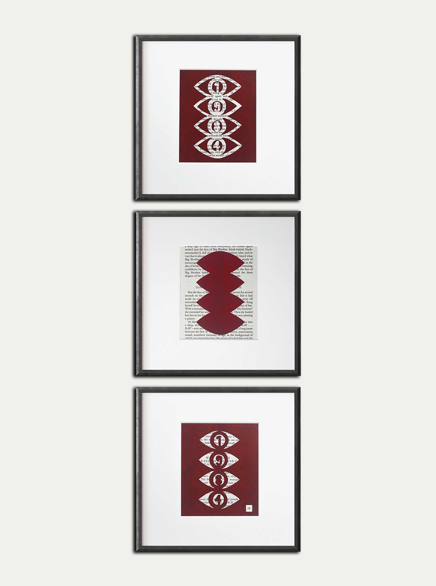 Book pages are loosley mounted onto dark red, grunge, 215gsm fine art paper.
