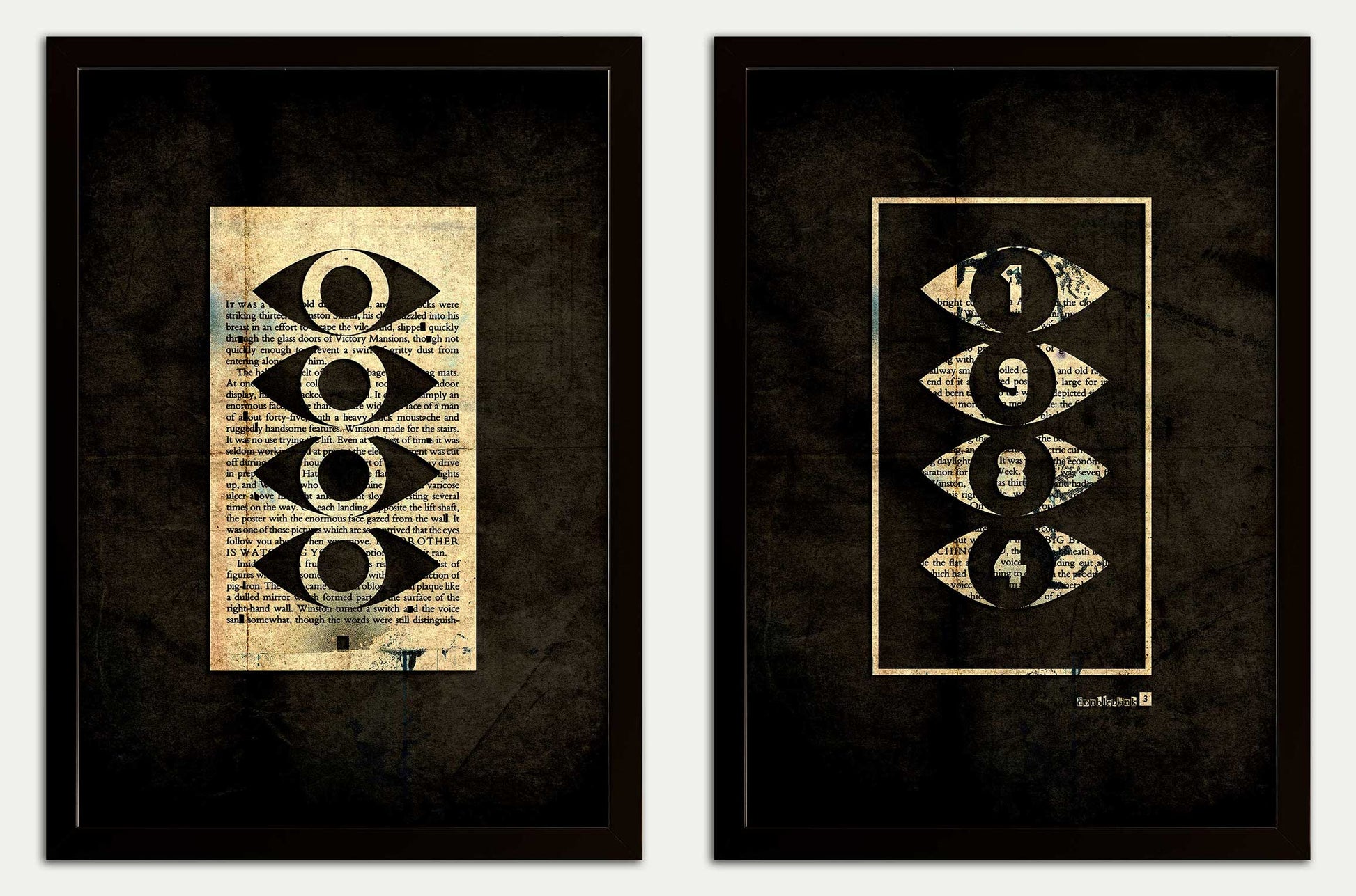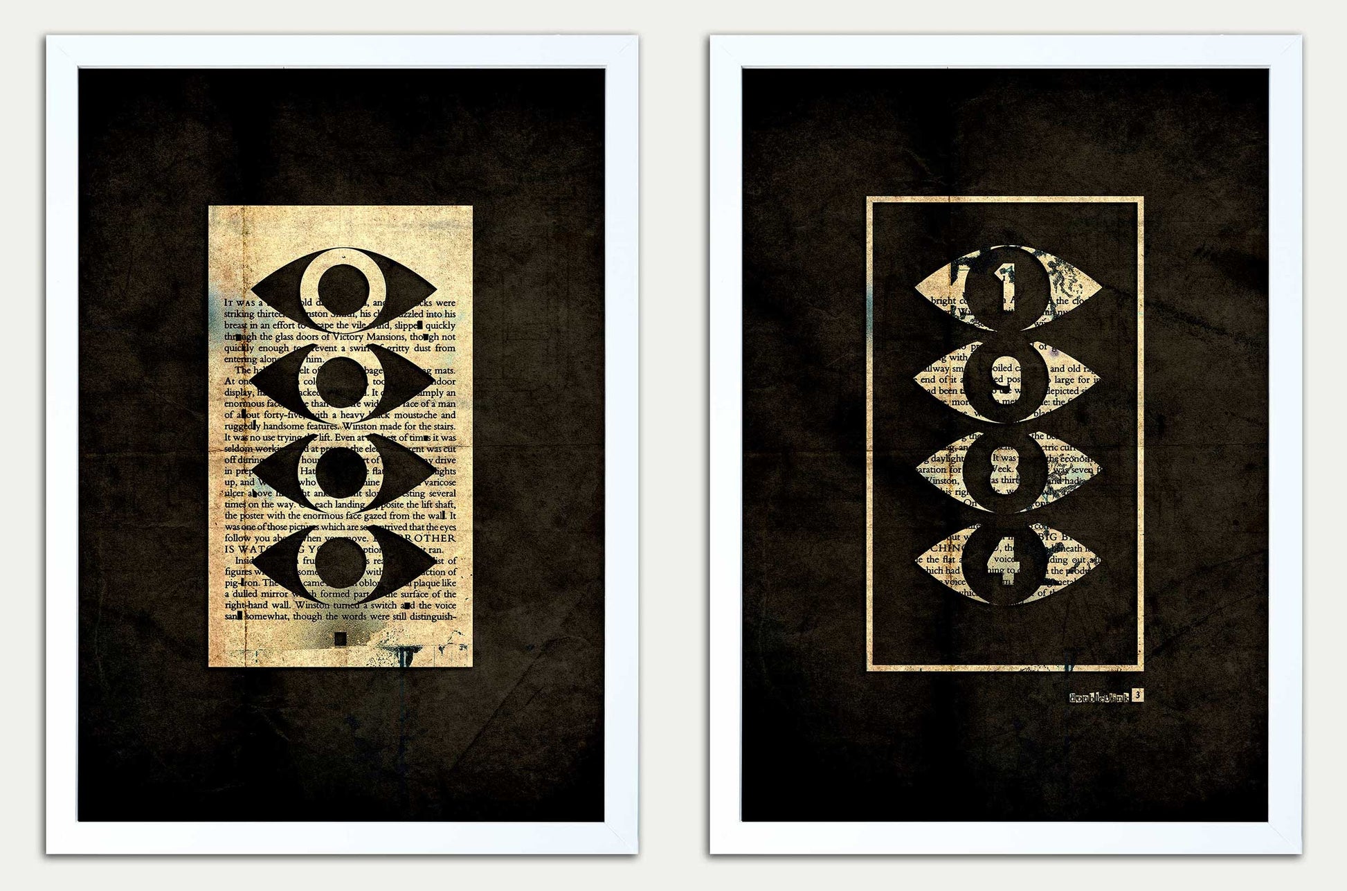I have taken the opening page (page 3) and cut out the line "Doubleblink 3". This is a play on words and relates to Orwell's infamous DOUBLETHINK - combined with the page number. Both artworks are constructed from a single page.