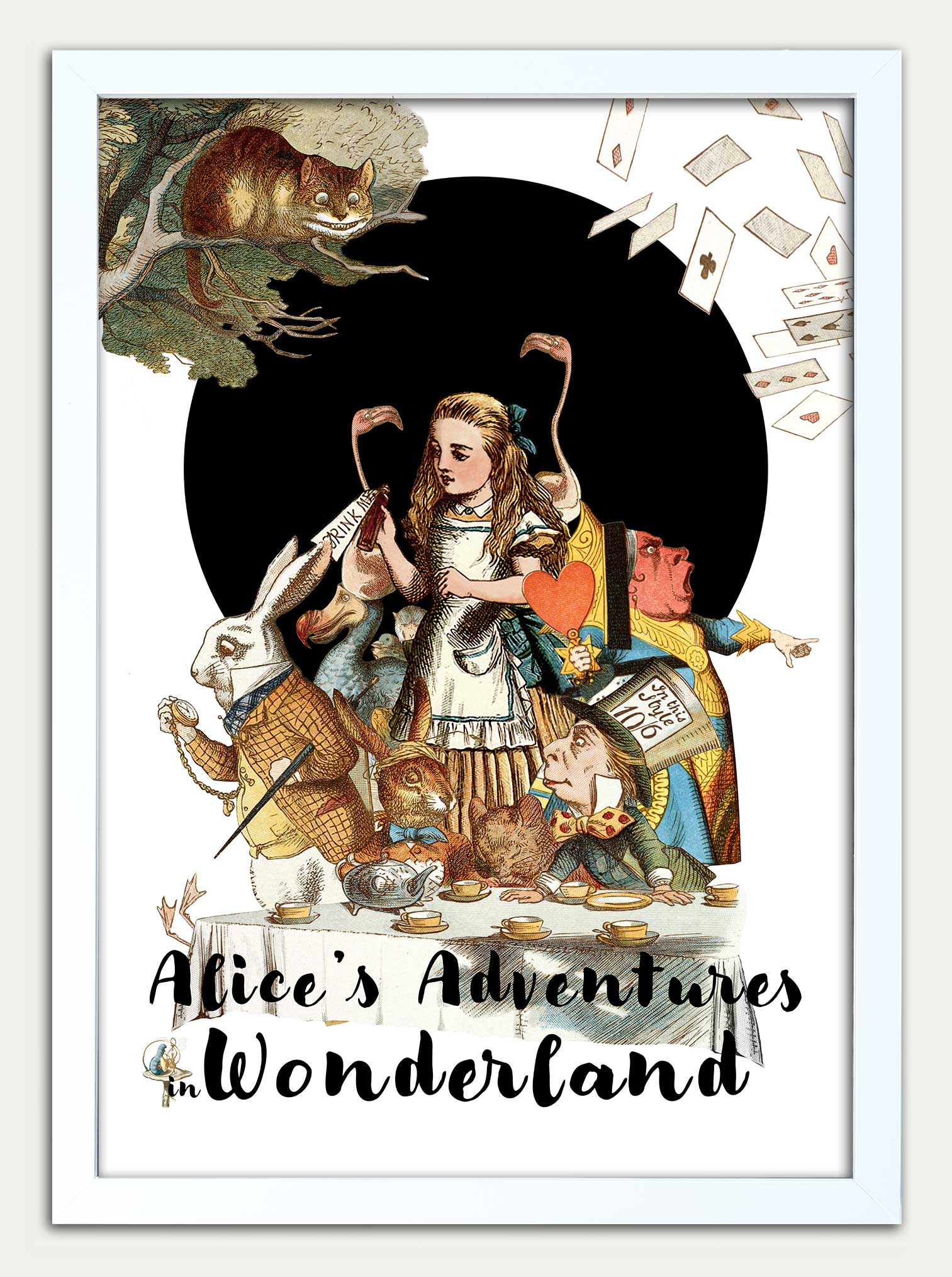 Alice in Wonderland fine art print featuring John Tenniel's iconic Alice illustrations collaged together before the yawning black rabbit hole.