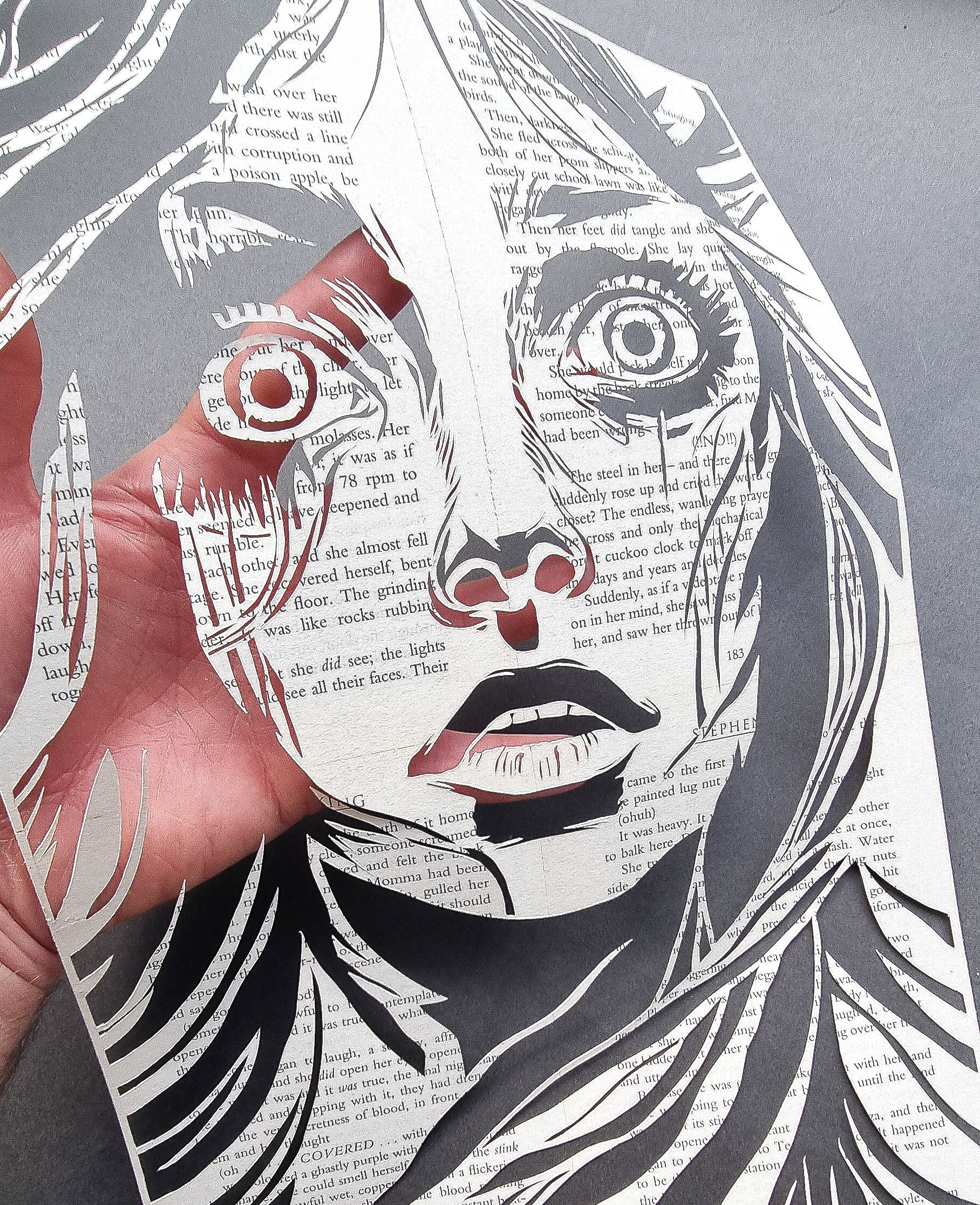 I've used the pages in which Carrie unleashes hell on her prom classmates. The cut out letters at the bottom of the page read: "And then the world exploded." [a line from the novel]