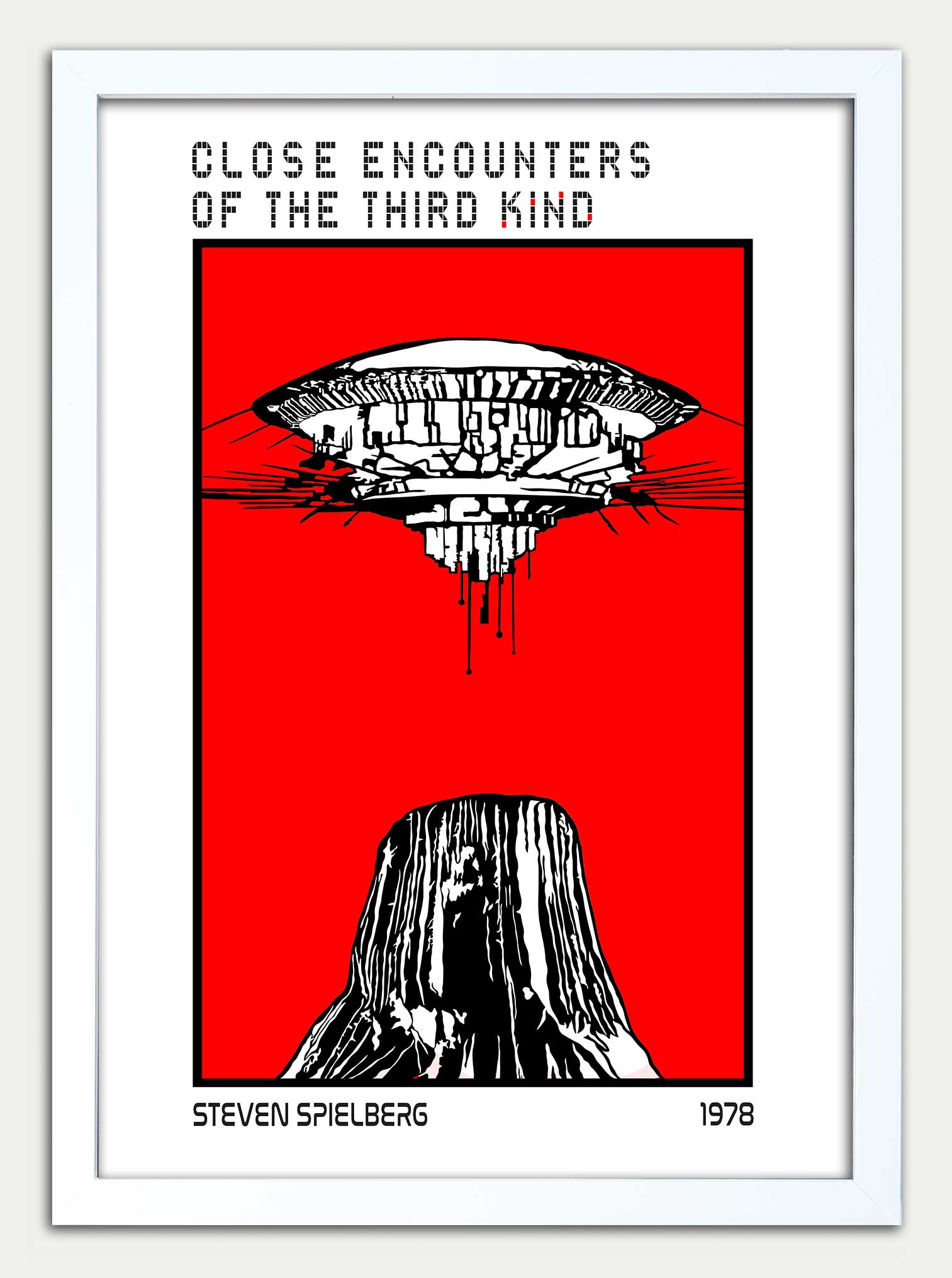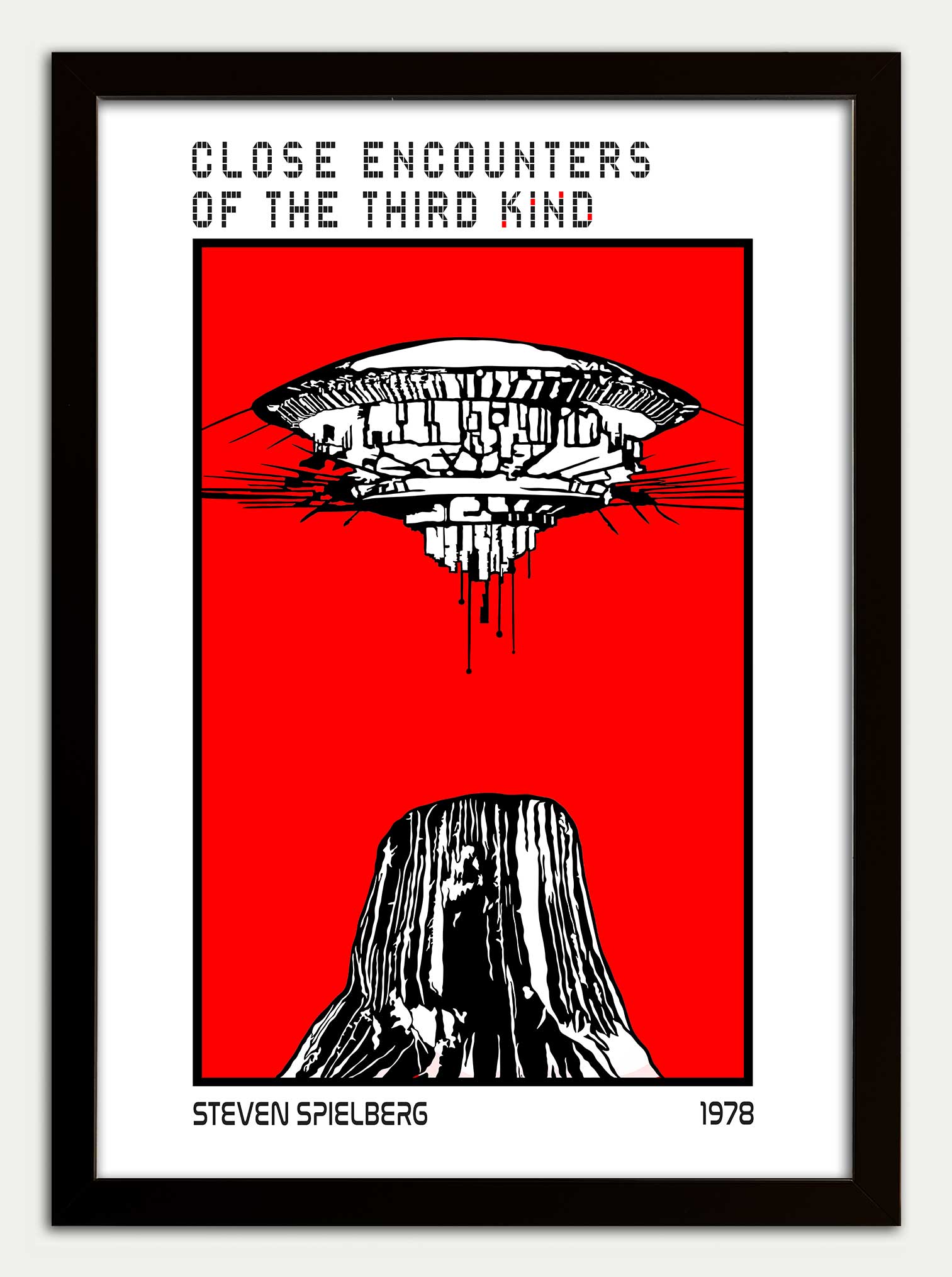 Close Encounters of the Third Kind fine art print featuring the Mother ship hovering over Devil's Tower. Red edition