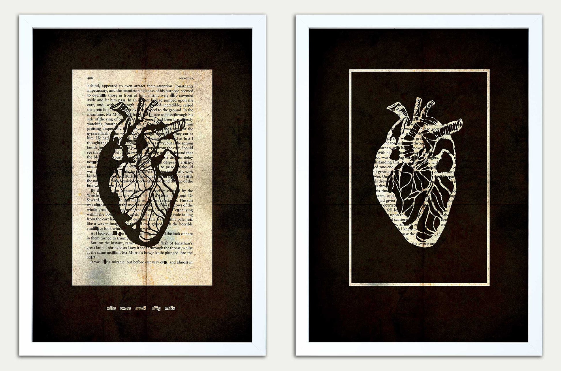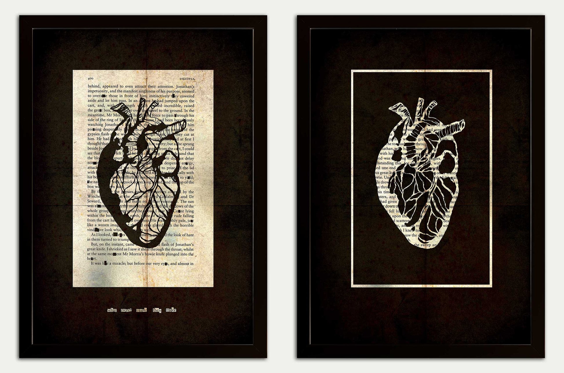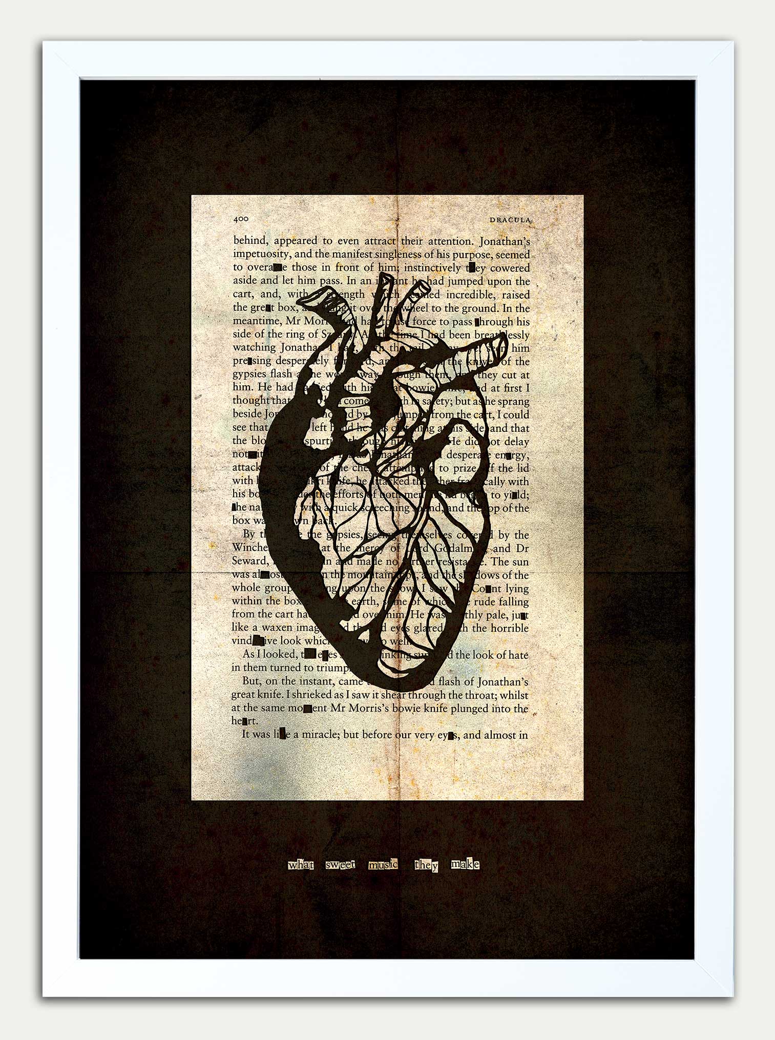Dracula //Heart Stopper 400" from Bram Stoker's Dracula. Fine art prints featuring an anotomical heart cut from page 400. This is the page in which the Count is slain with a bowie knife. I have cut out that classic Oldman line "What sweet music they make."