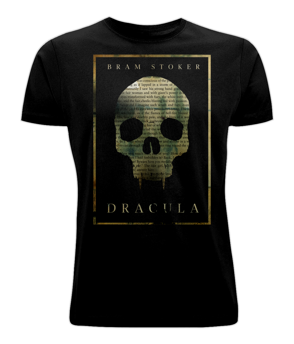 Dracula literature T-shirt. This is page 46 of Bram Stoker's gothic horror masterpiece Dracula. It features the moment the Count 'saves' Jonathan Harker from three young ladies [vampires] who cast no shadows.