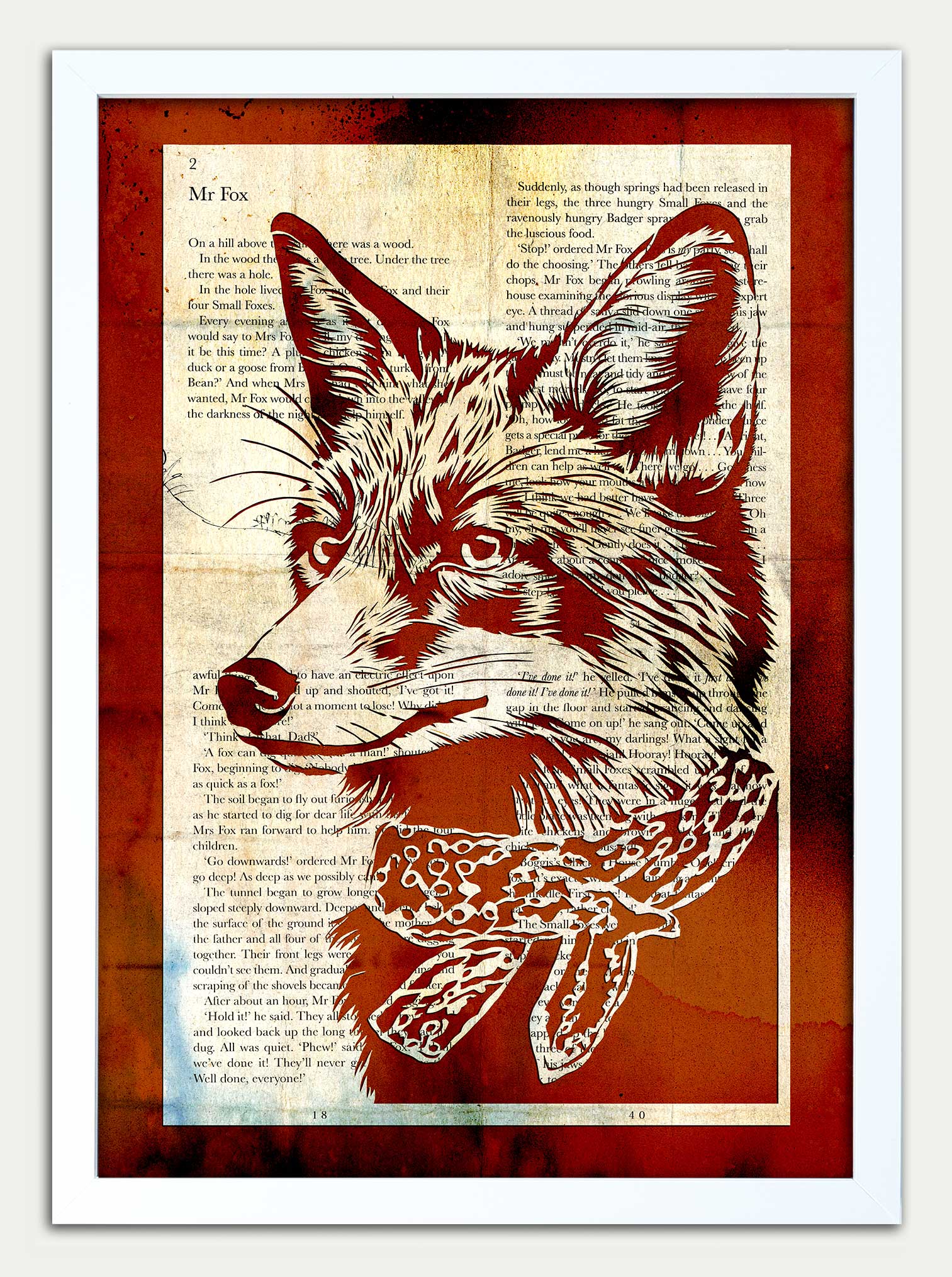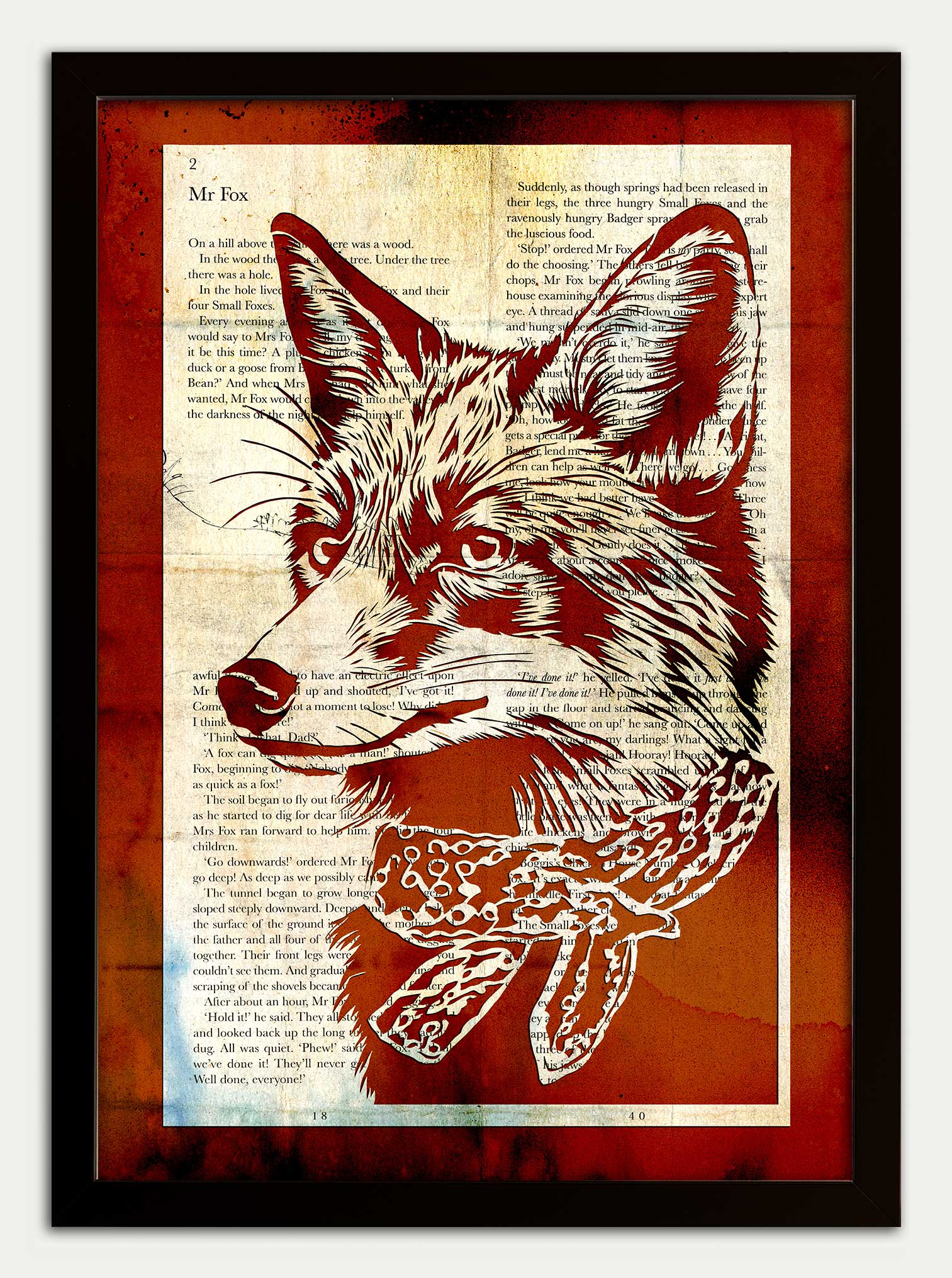 Fantastic Mr Fox fine art print. Based on my original hand cut artwork using 4 pages of Roald Dahl's 1970 novel Fantastic Mr Fox.