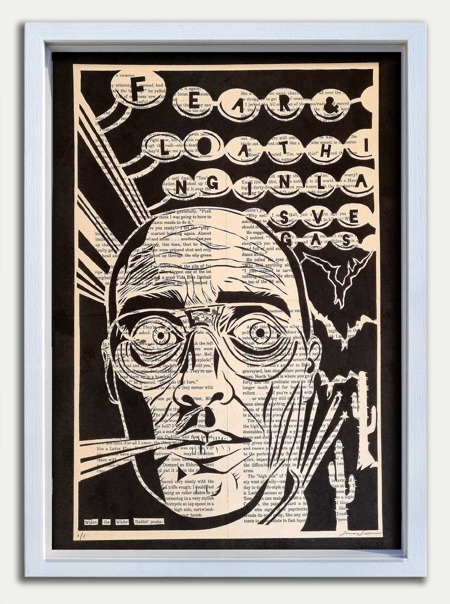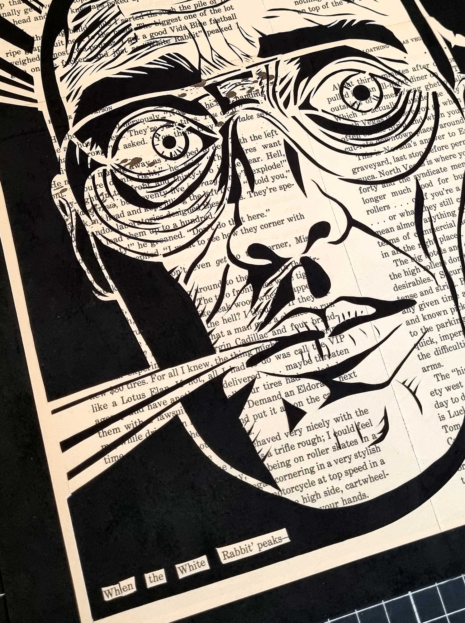Fear and Loathing original papercut inspired by Hunter S Thompson's novel. This piece is hand cut from 4 pages of Thompson's savage book. I have used letters from the pages to recreate the line "When the white rabbit peaks".