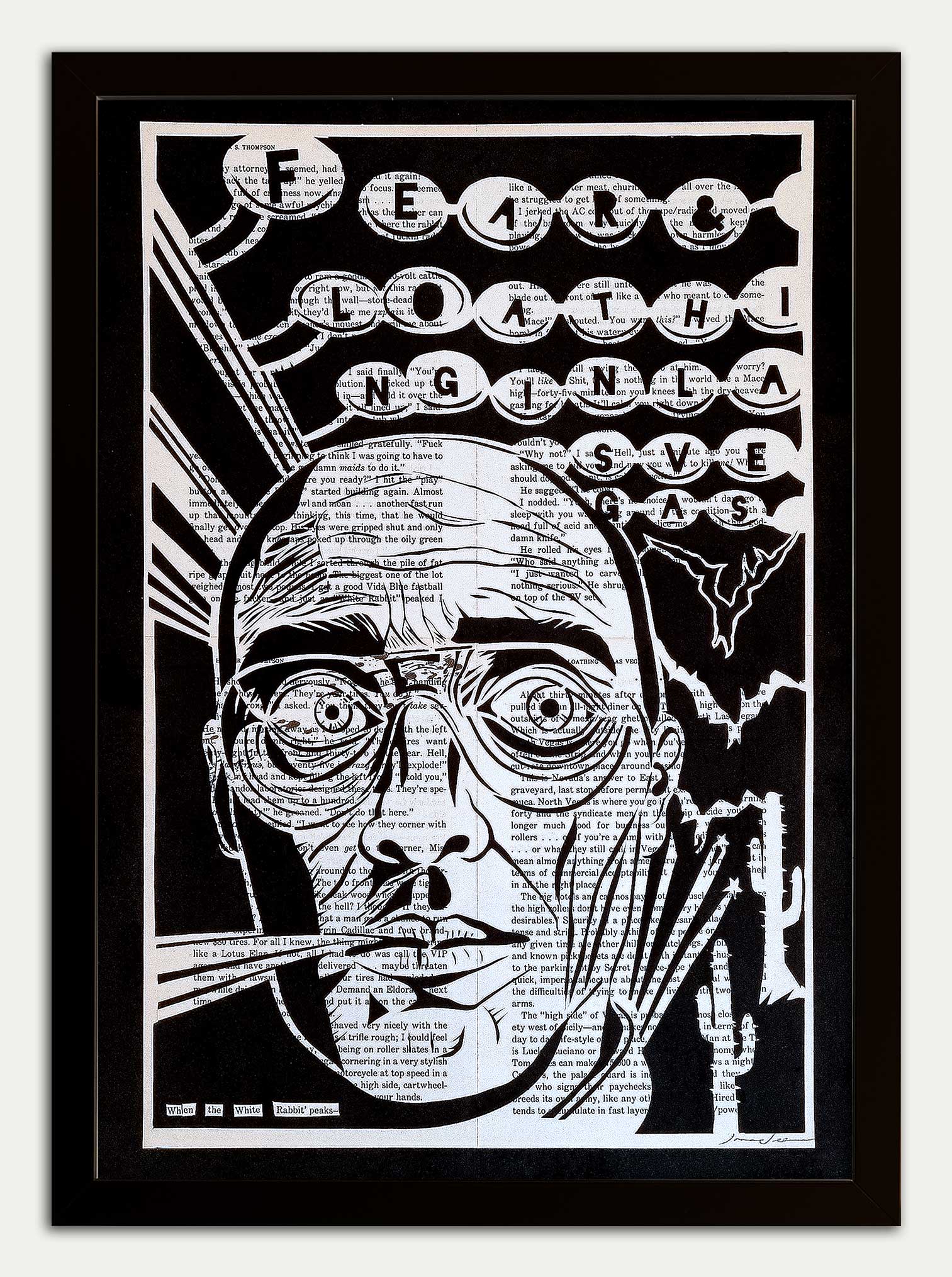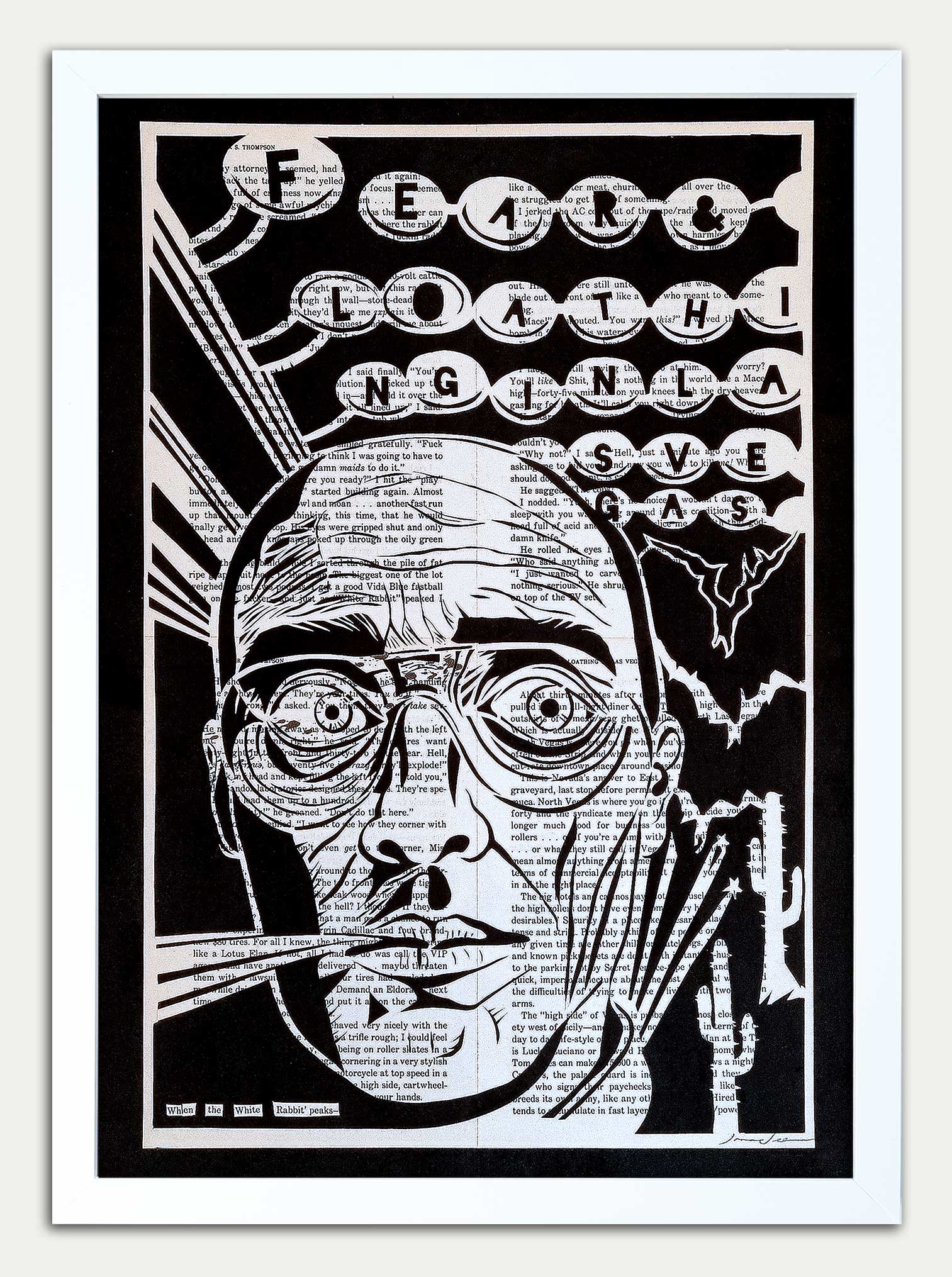 Fear and Loathing fine art print based on my original papercut inspired by Hunter S Thompson's novel. I have used letters from the pages to recreate the line "When the white rabbit peaks".