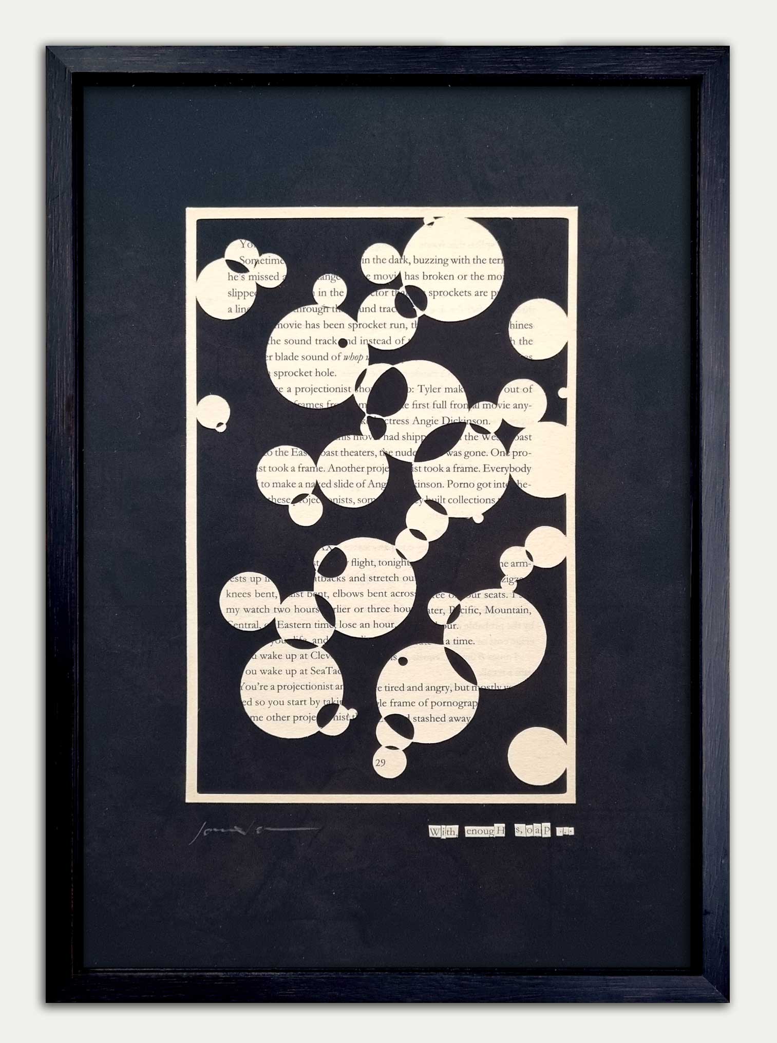 I have based my cut on Tylery's line "With enough soap you could blow up the whole world." These are soap bubbles all cut from a single page. Features hand cut letters that read "With enough soap..."