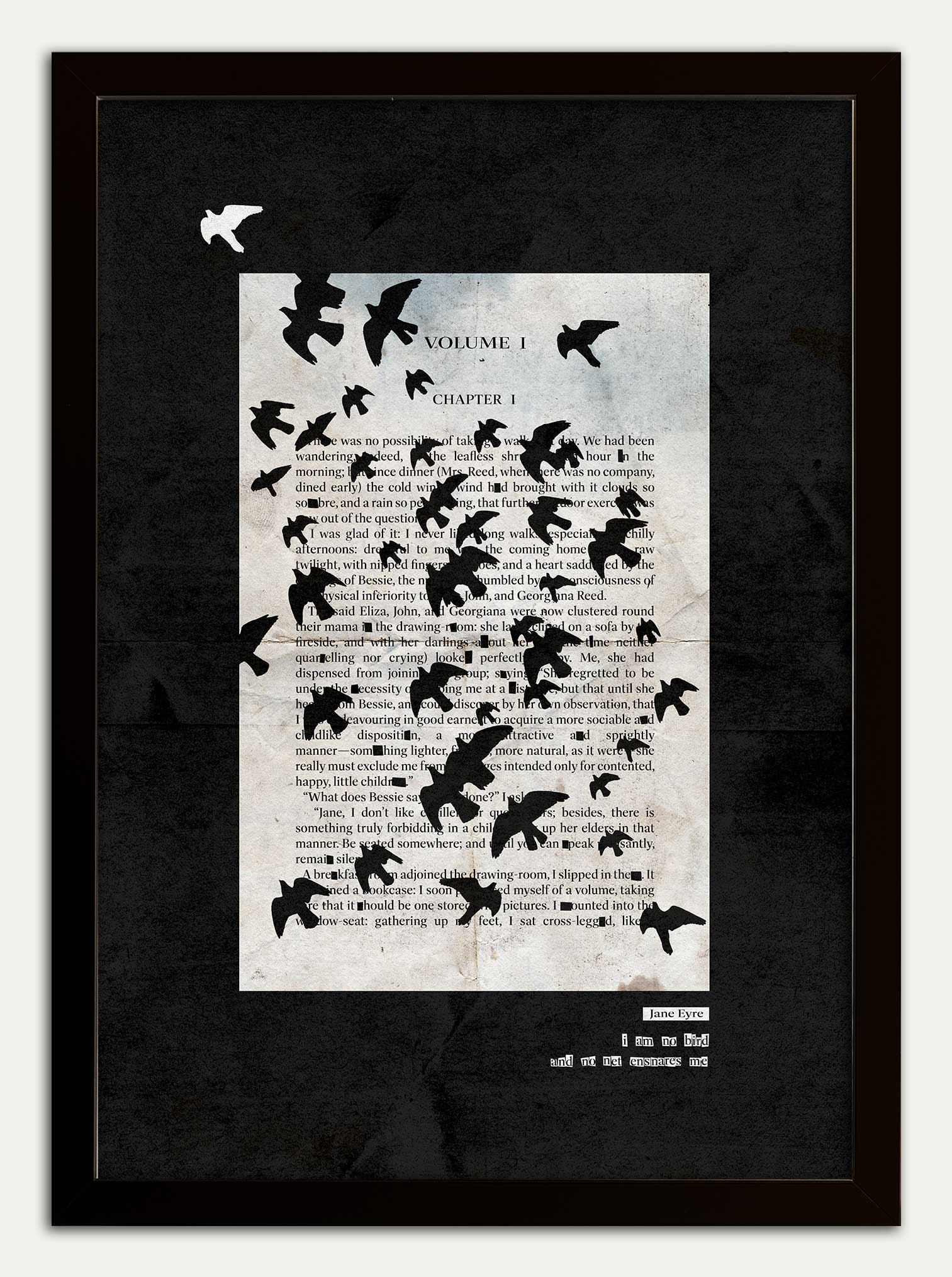 Jane Eyre book art print. Features the opening page of Charlotte Bronte's 1847 classic Jane Eyre. I have cut out letters and used them to create one of Jane Eyre's best lines: