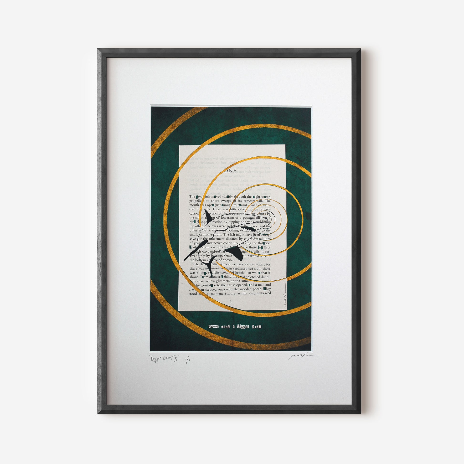 I have cut out letters, keeping them in the order they were found on the page, to create that classic line "GONNA NEED A BIGGER BOAT." No shit. This line is mounted beneath the book page.