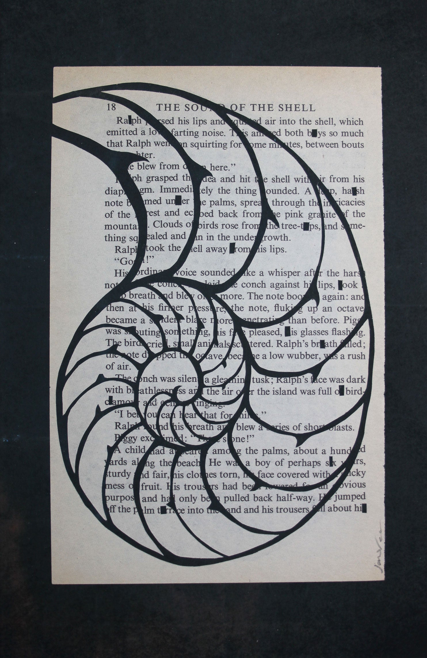 This is the page in which the boys find and use the conch. I have cut out letters and used them to create the novel title. As with all of my work, each letter is used in the order it was found on the page.