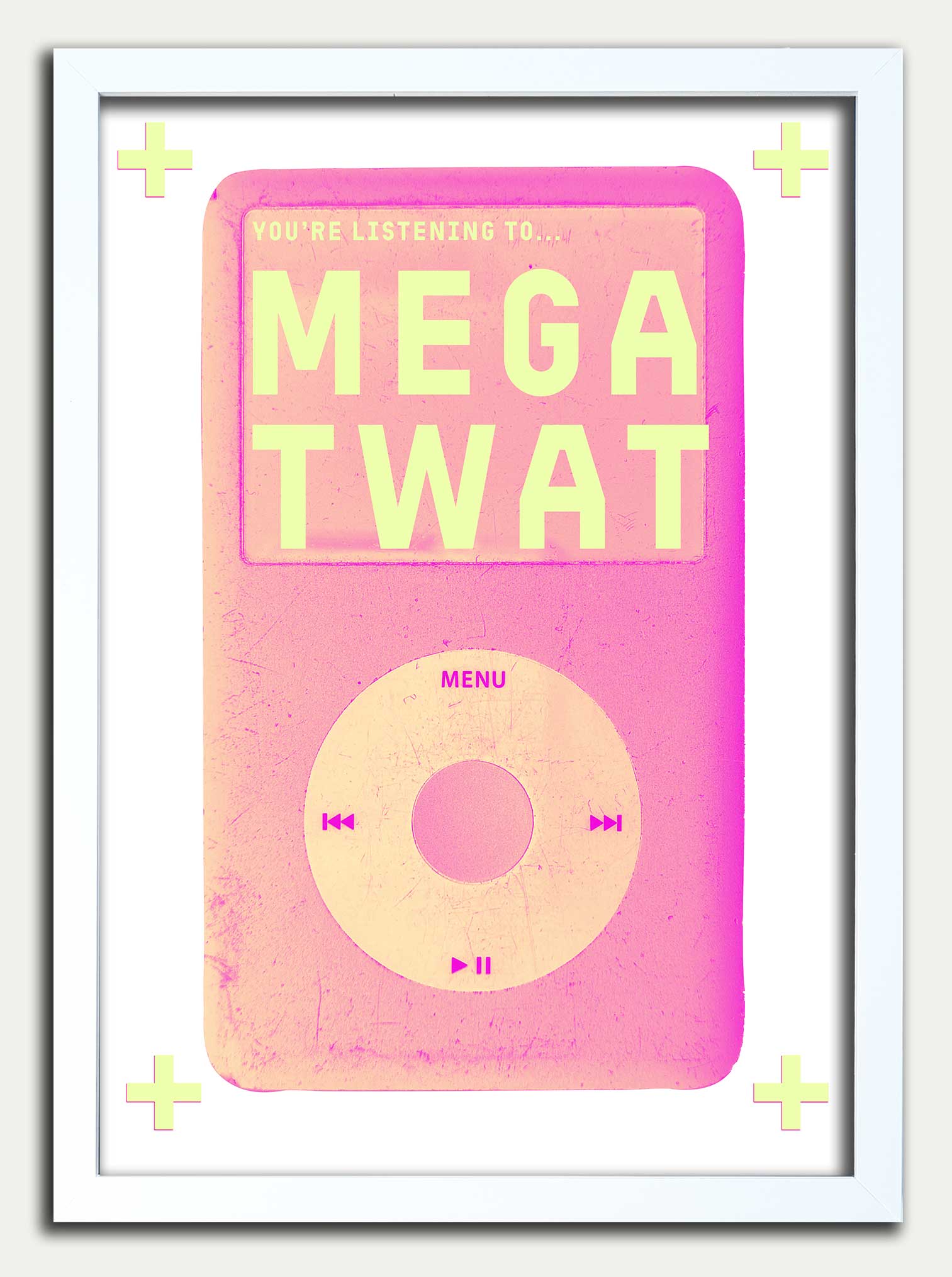 "iPod MEGA TWAT" fine art print. This is my battered old iPod Clasic re-branded.