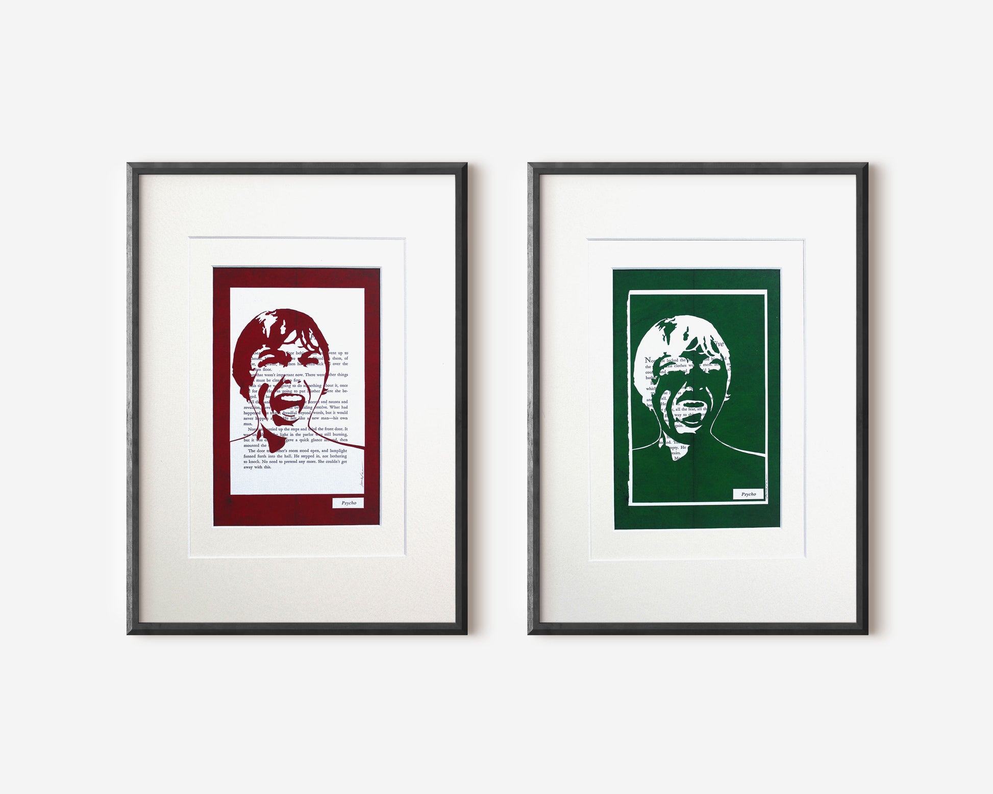 Both artworks are hand cut from page 55 of Robert Bloch's novel. This is the page focussing on the immediate aftermath of the the shower scene. The actual scene doesn't feature in the novel - that was all Hitchcock