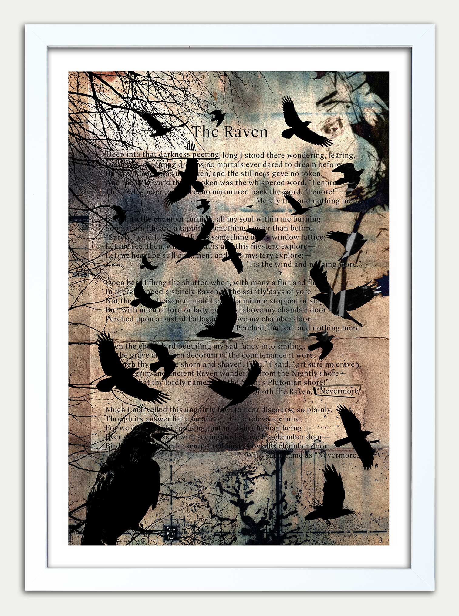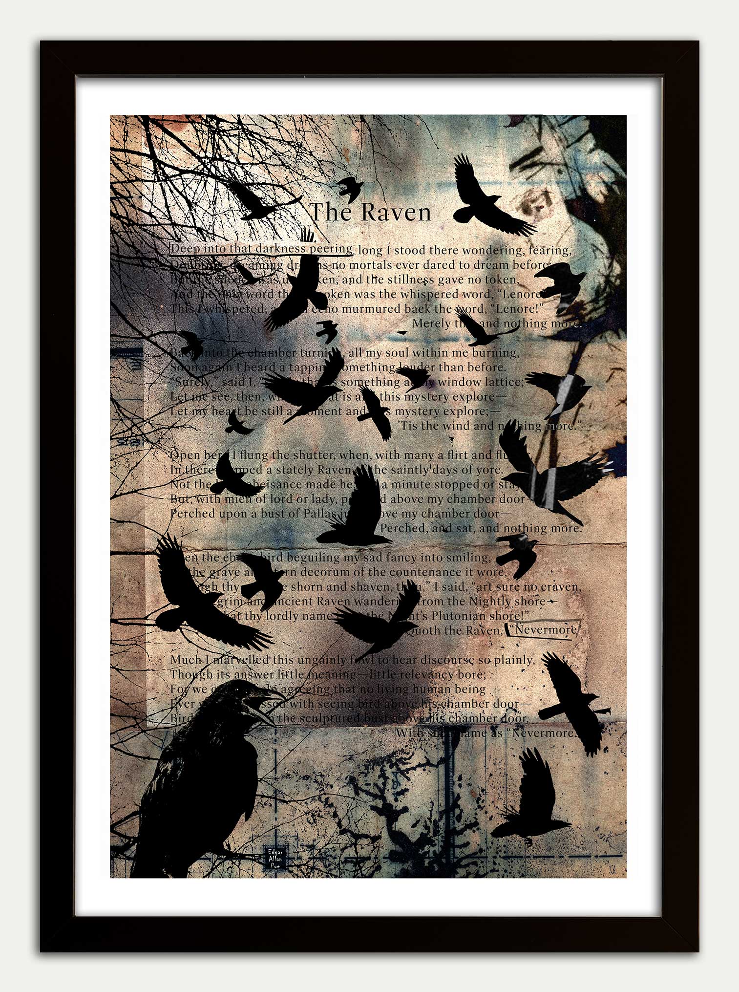 The Raven artwork by Edgar Allan Poe. Features verses 5, 6, 7, 8, 9 from E.A.P.s seminal work The Raven. This is the 2nd print in a 4 part collection. It is designed to lead on from Fantastic Terrors] both in narrative and visual design [the trees are left behind on the left hand side of the print]