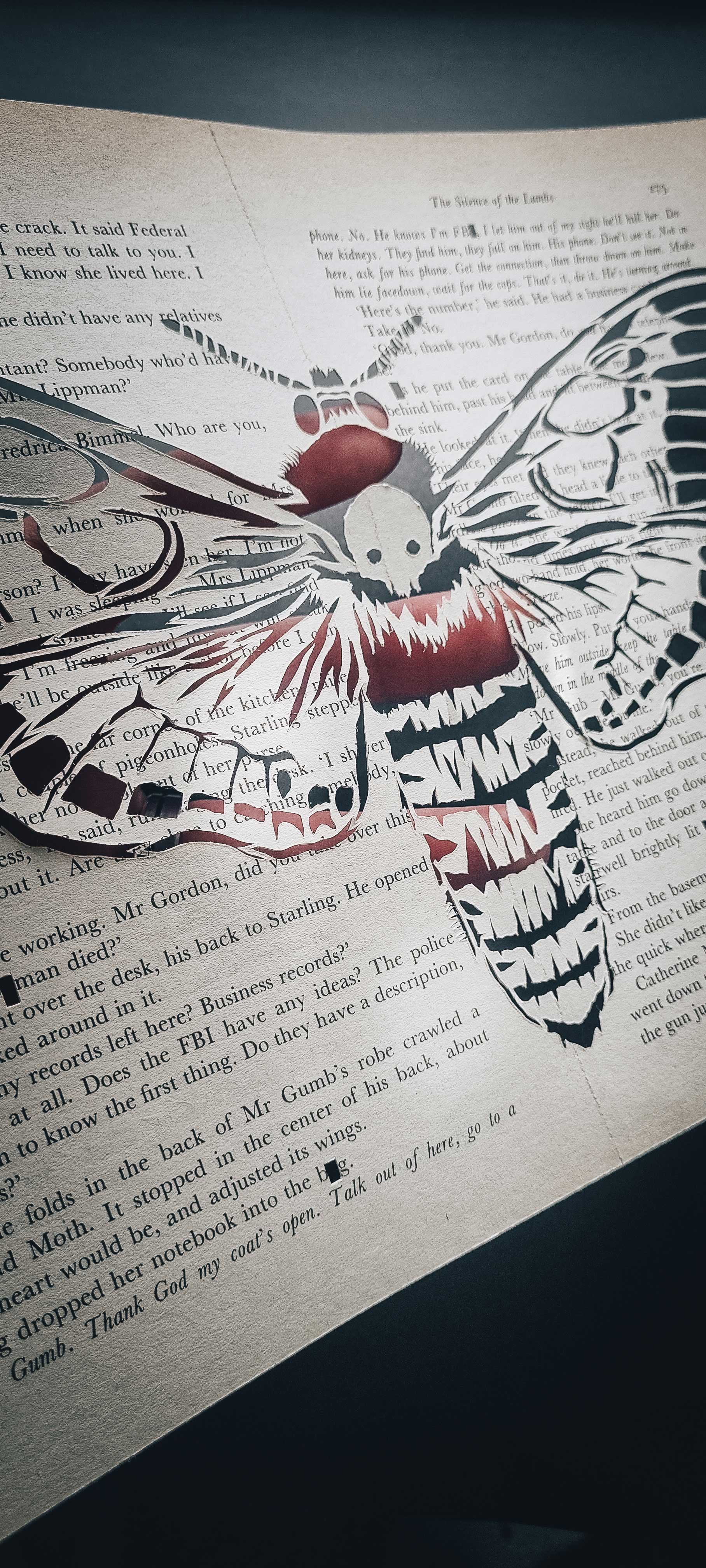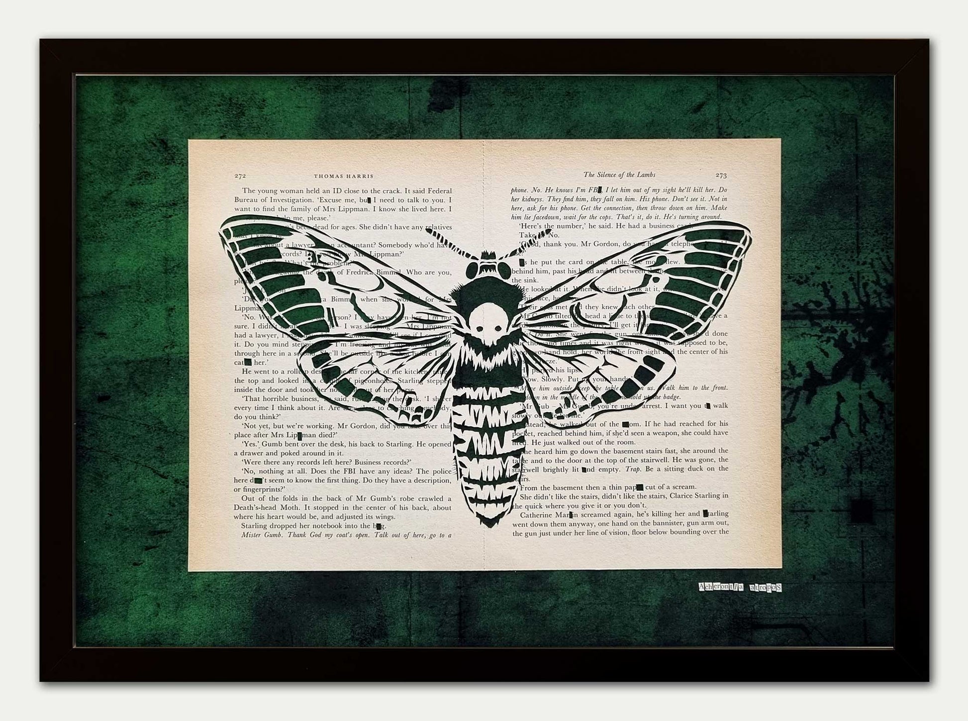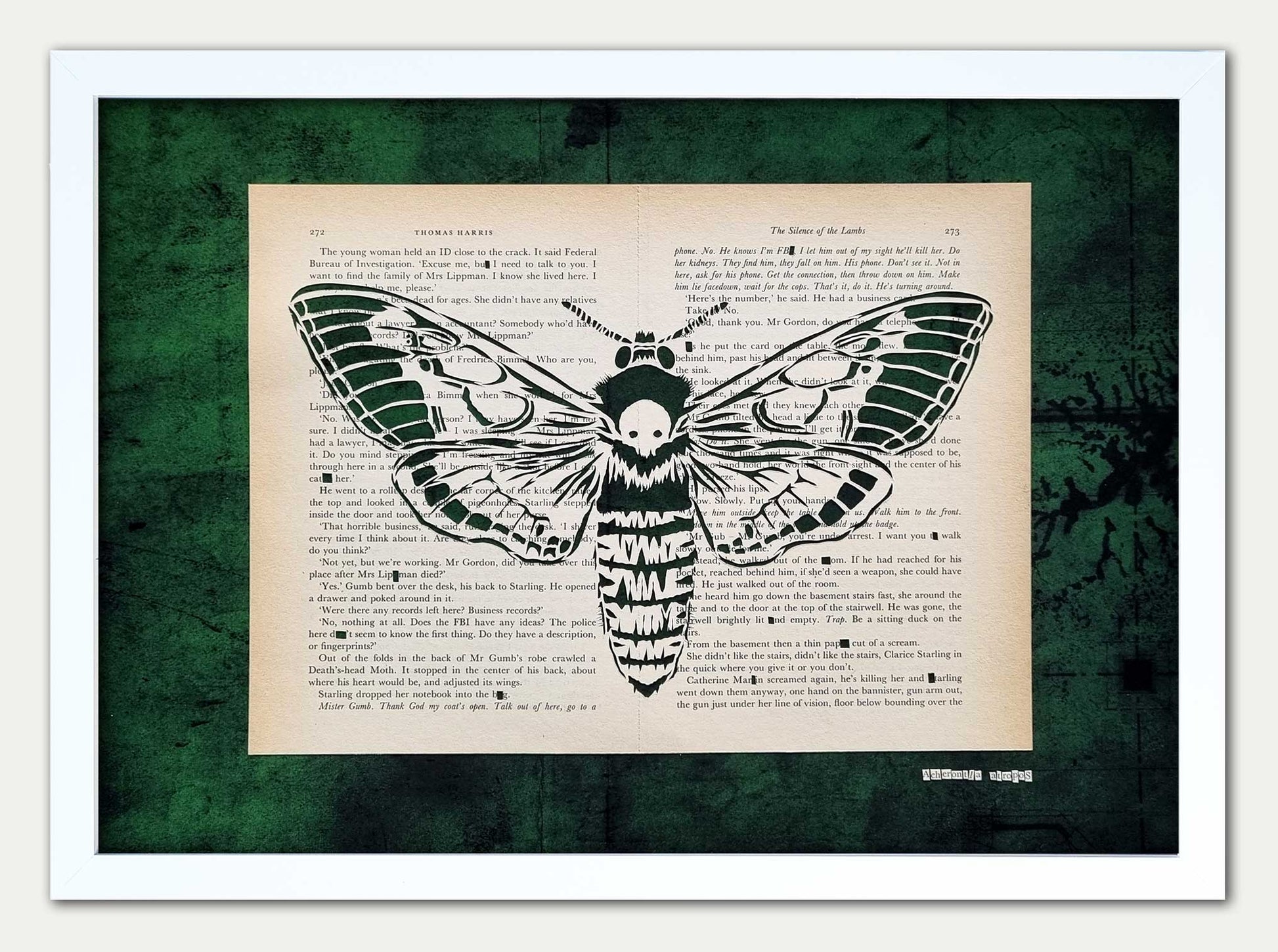 Silence of the Lambs original, hand cut artwork. This is Acherontia atropos AKA The Death-Head Hawk Moth. Hand cut from pages 272 and 273 of Thomas Harris' novel Silence of the Lambs. These are the pages in which FBI agent Clarice Starling comes face to face with Buffalo Bill. He is given away by a death-head moth crawling from the folds of his robe.
