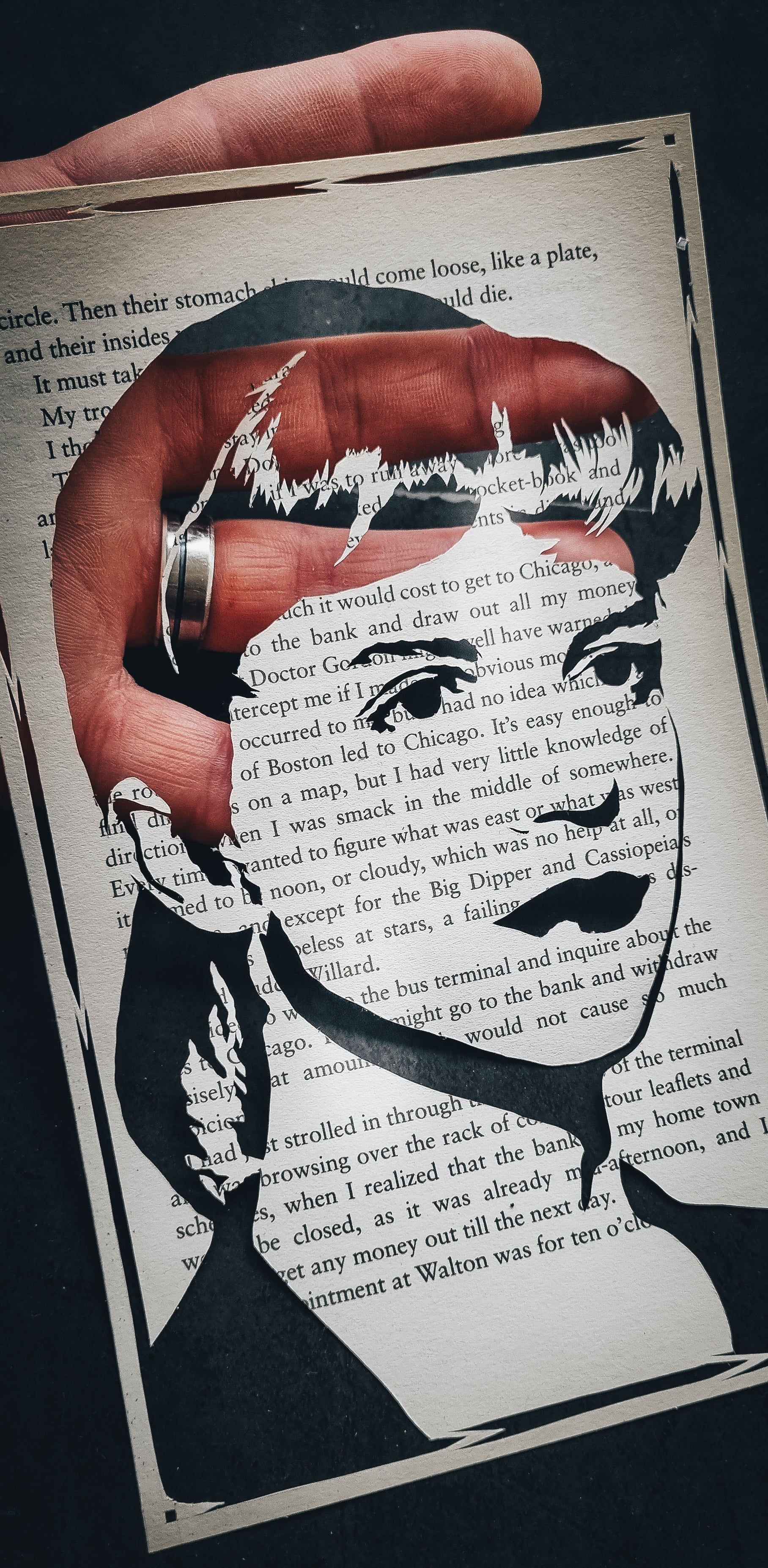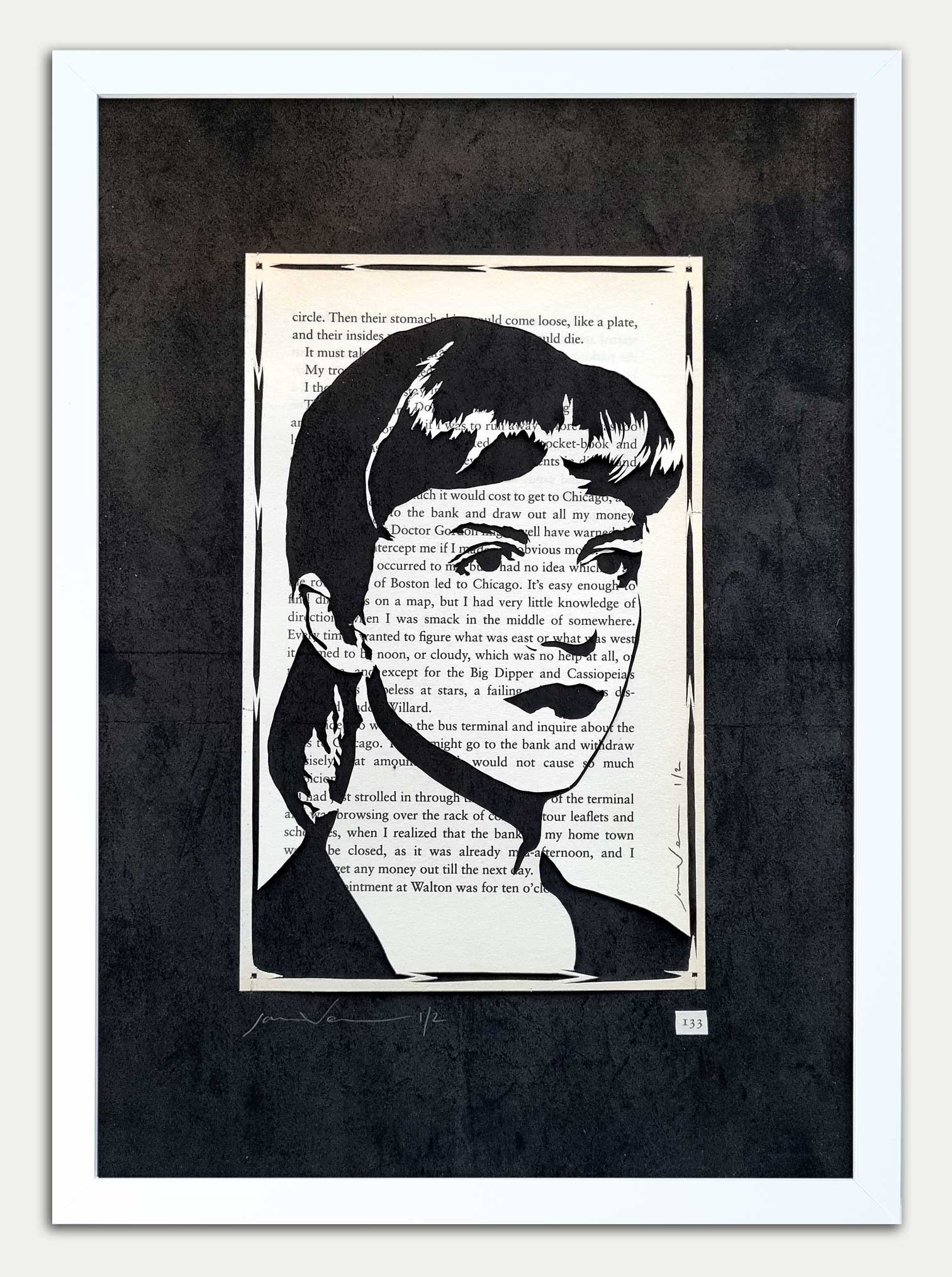 Portrait of Sylvia Plath hand cut from page 133 of her novel The Bell Jar