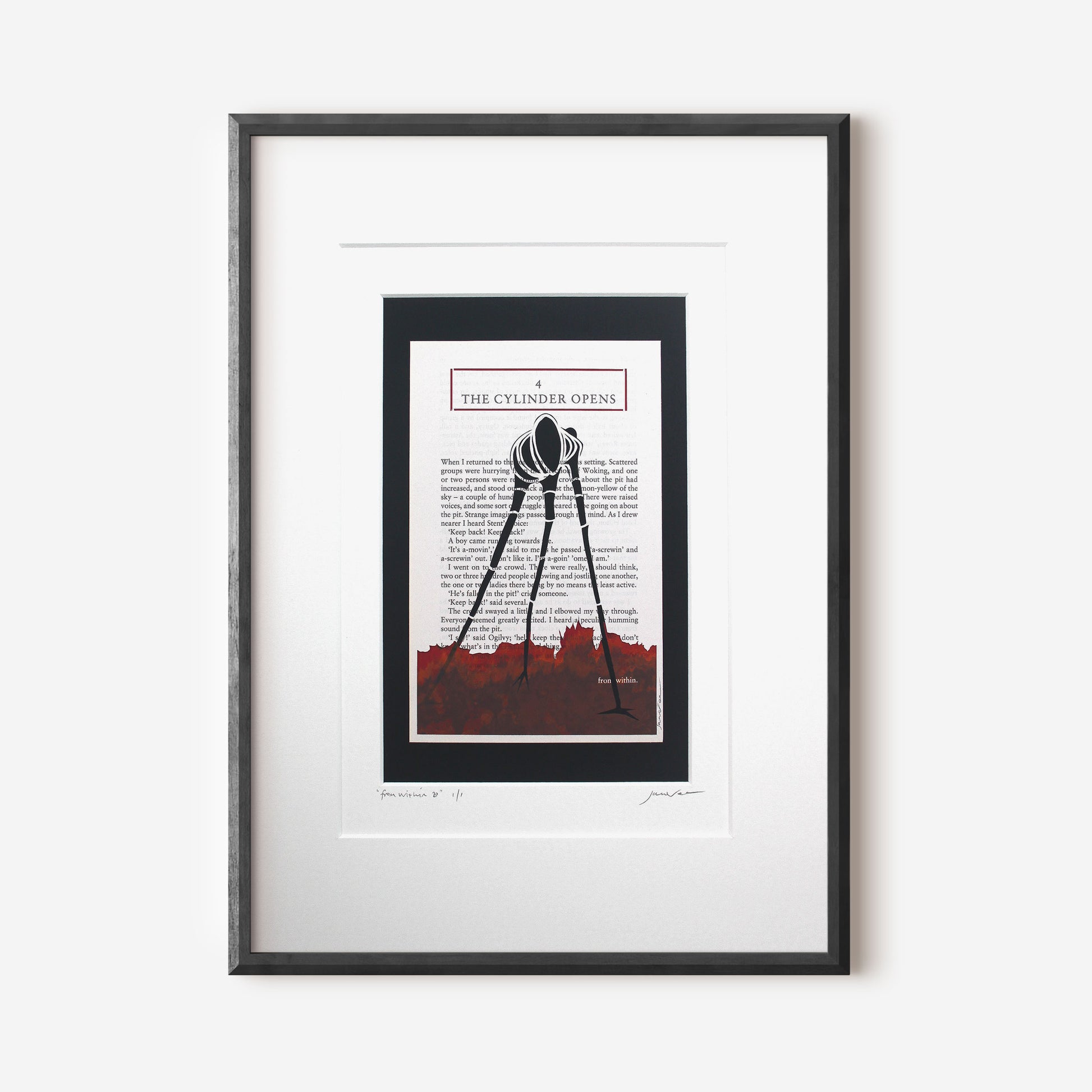 This is a new Tripod design. An organic tripod striding through the fire on Horsell Common cut from the chapter title page "4 The Cylinder Opens". I have cut away the lower 1/4 of the page. The fire is printed on the page beneath. This printed page is 215gsm fine art paper.
