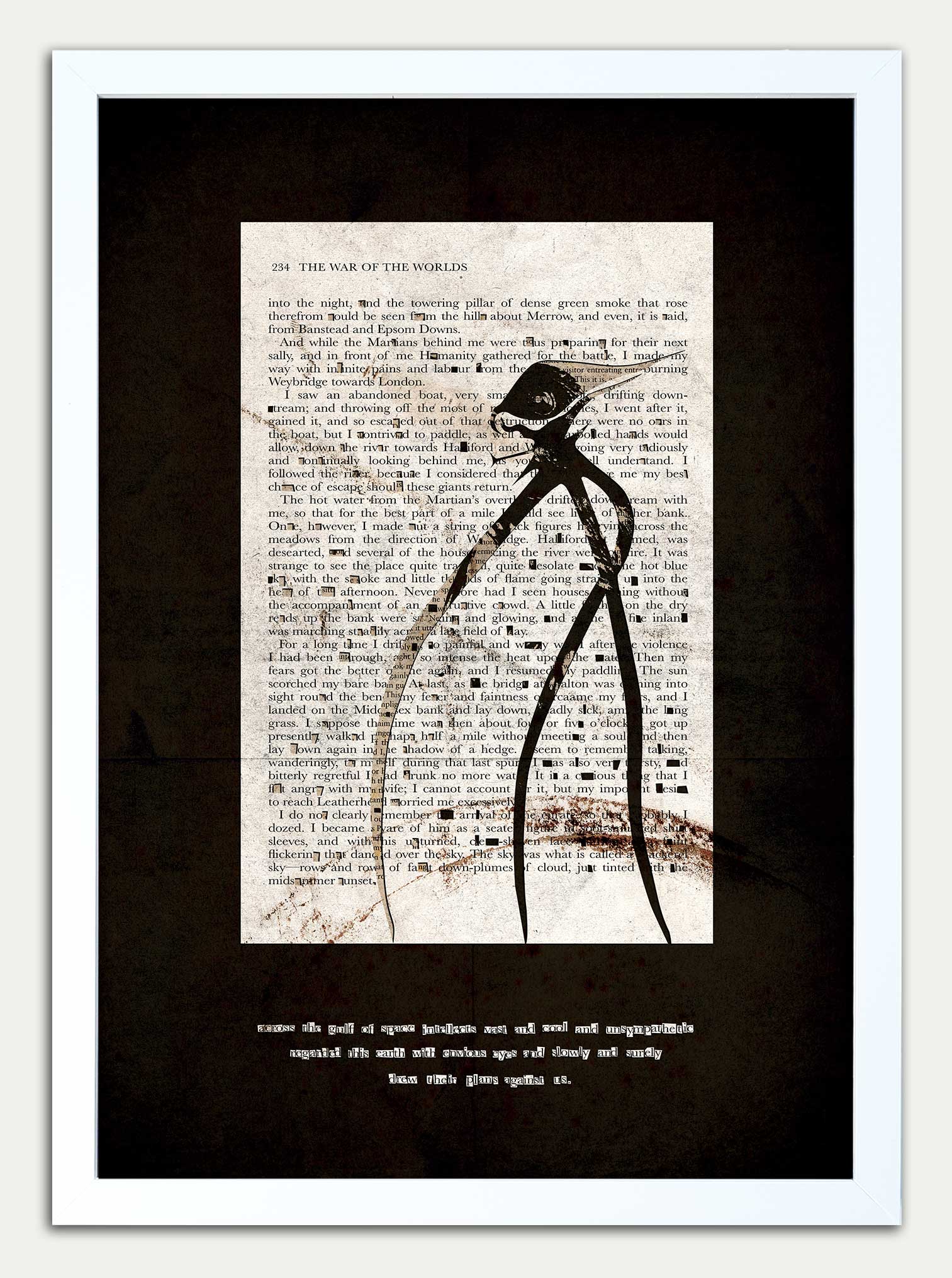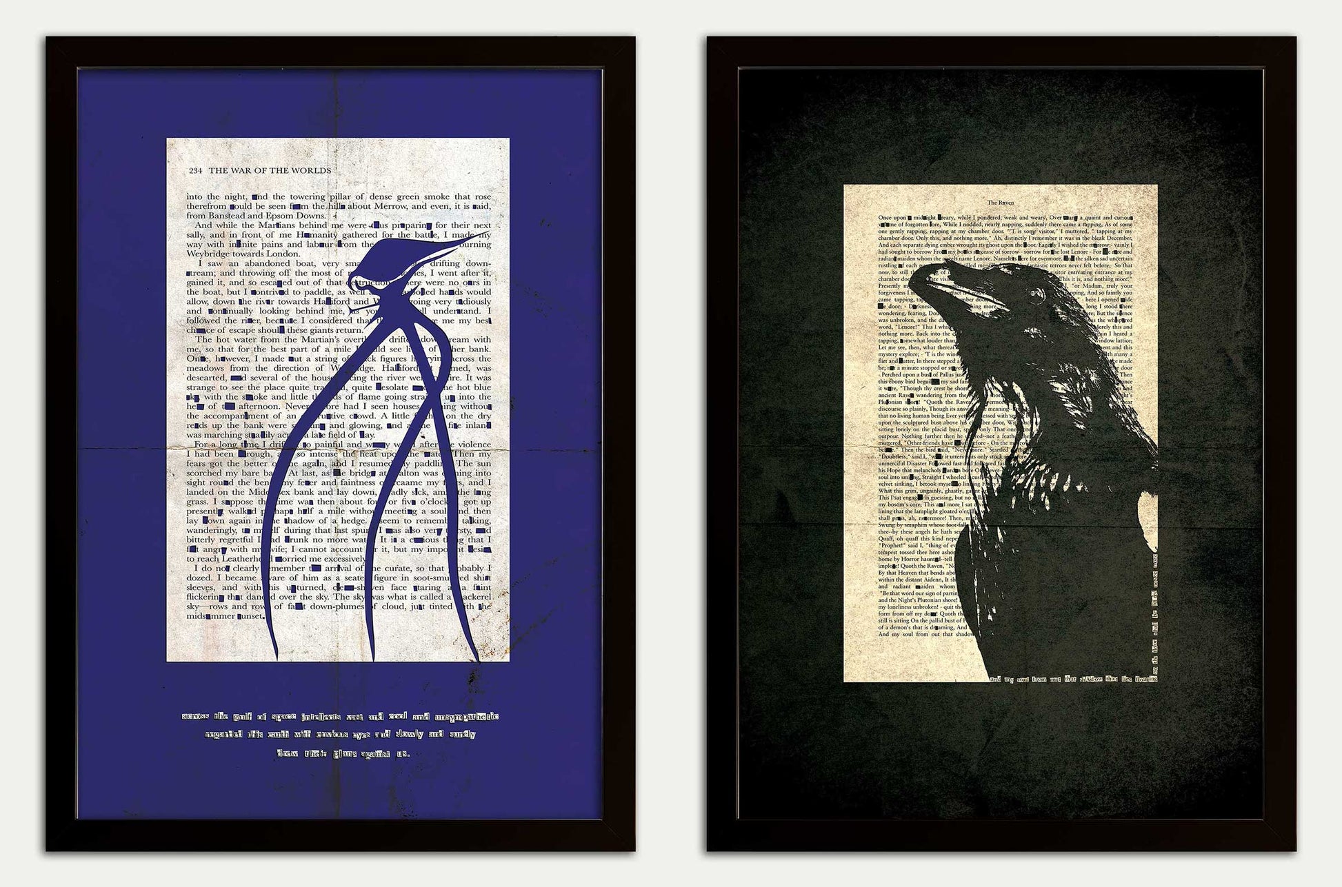 When 2 prints collide. A grunge mashup print featuring page 234 from HG Wells' sci-fi masterpiece with Edgar Allen Poe's The Raven peaking from beneath.