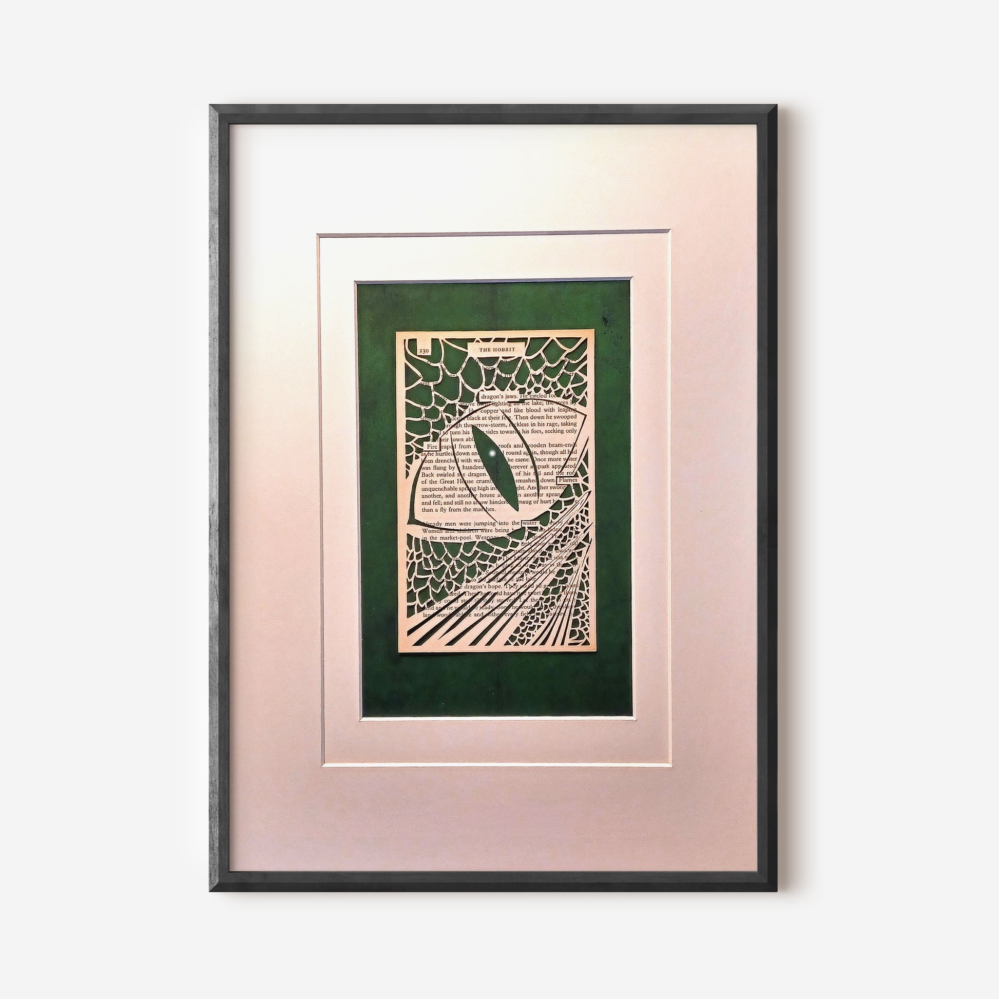 The Hobbit book art. Hand cut dragon scales drawn in on The Eye of Smaug. Cut from page 230 of Tolkein's The Hobbit.
