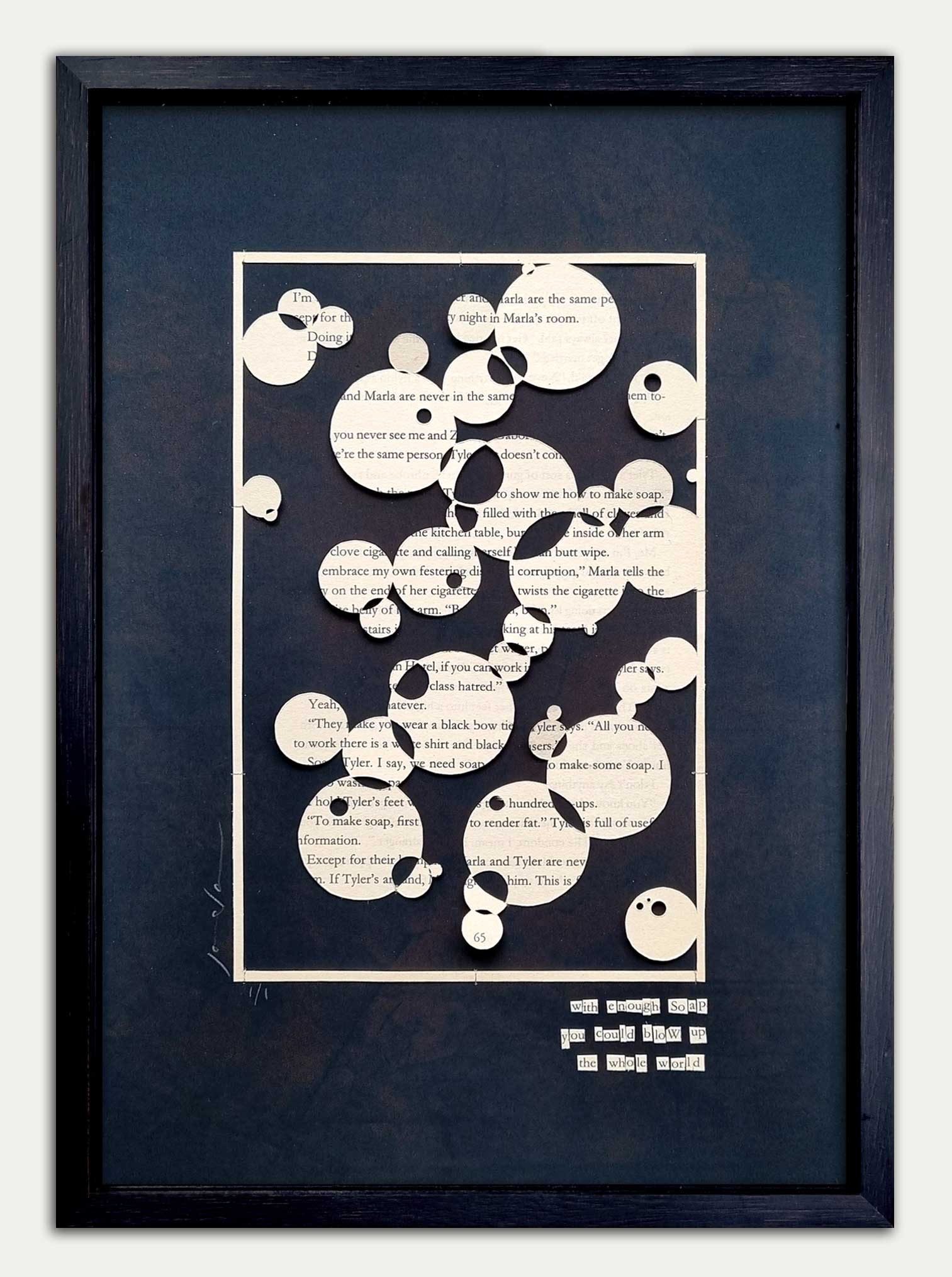 I have based my cut on Tylery's line "With enough soap you could blow up te whole world. These are soap bubbles all cut from a single page. I have been careful to position words such as 'render fat' and 'make some soap'