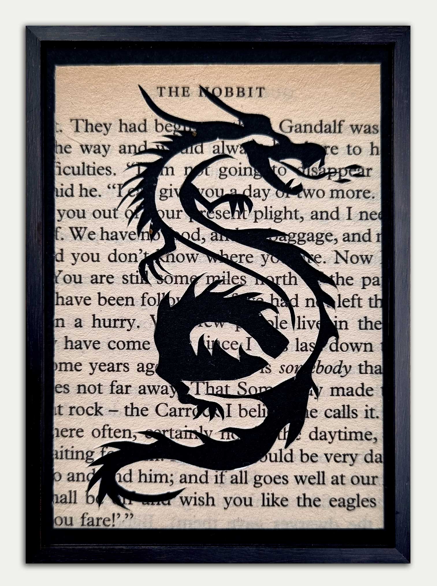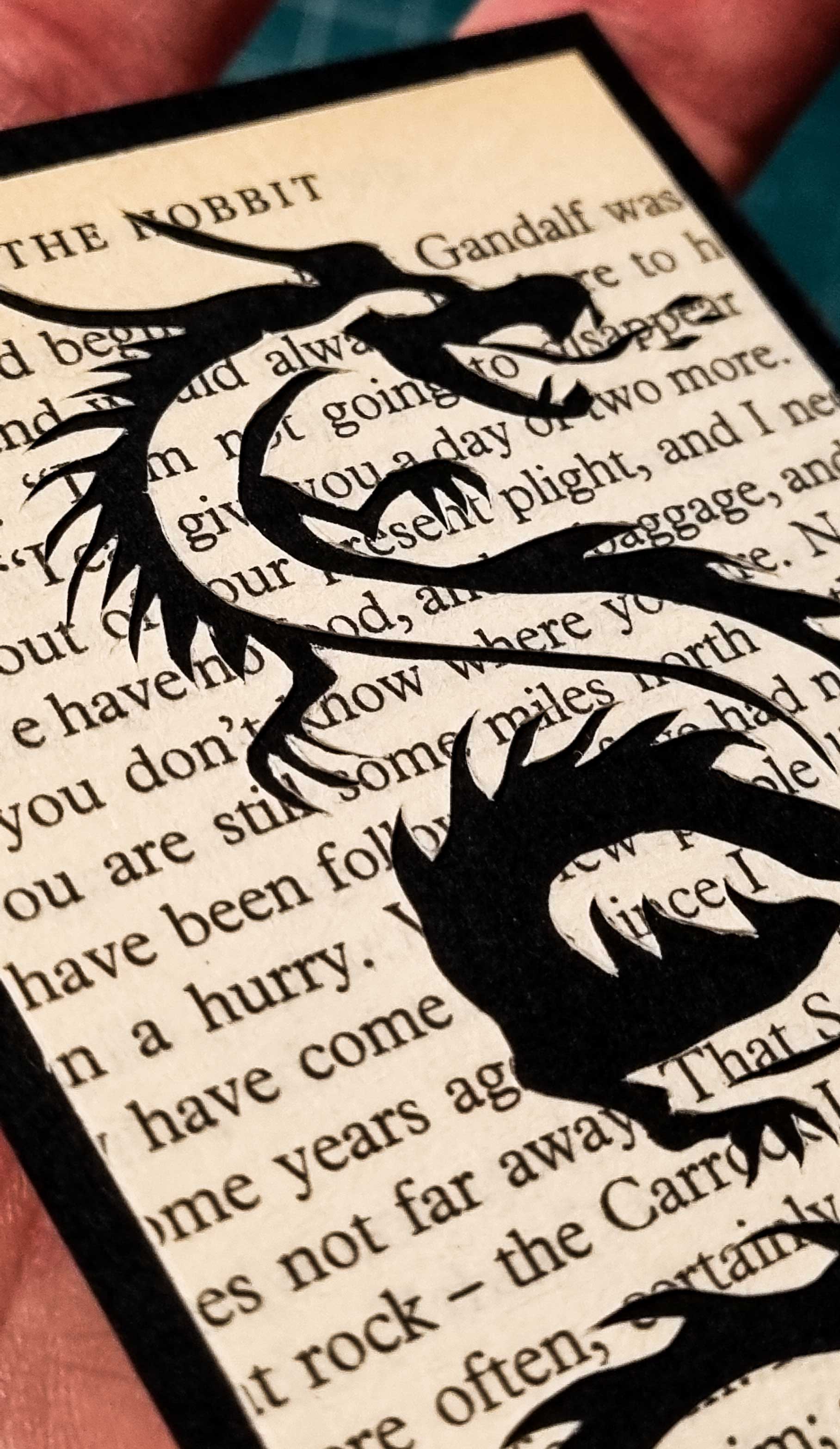 The Hobbit hand cut miniature artwork (ACEO*). Hand cut from a single page of JRR Tolkien's novel The Hobbit. Each papercut is mounted onto a black background.