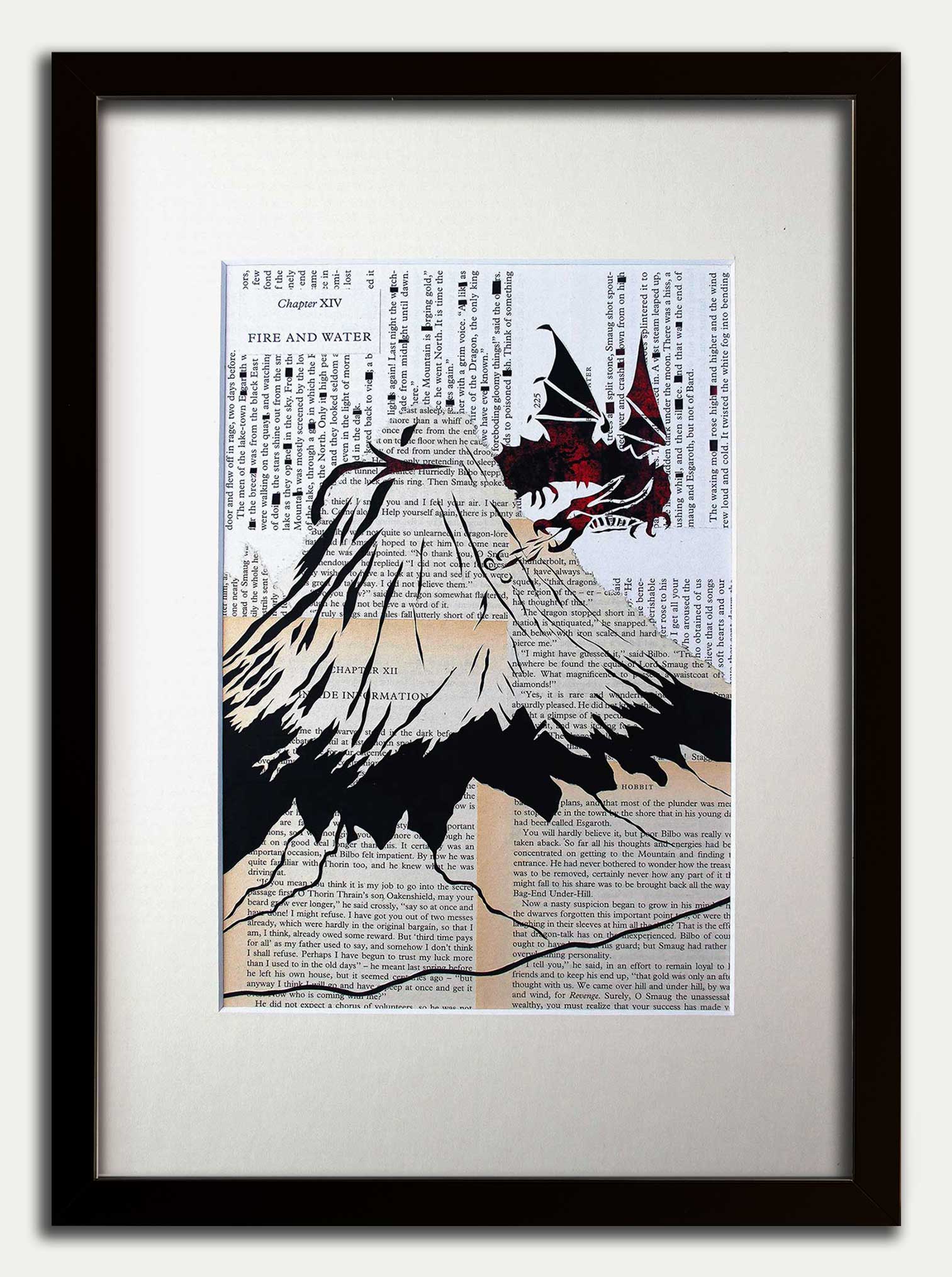 The Hobbit original artwork. Composed of pages from 2 different copies of JRR Tolein's The Hobbit. Pages drawn from Fire and Water; and Inside Information chapters.