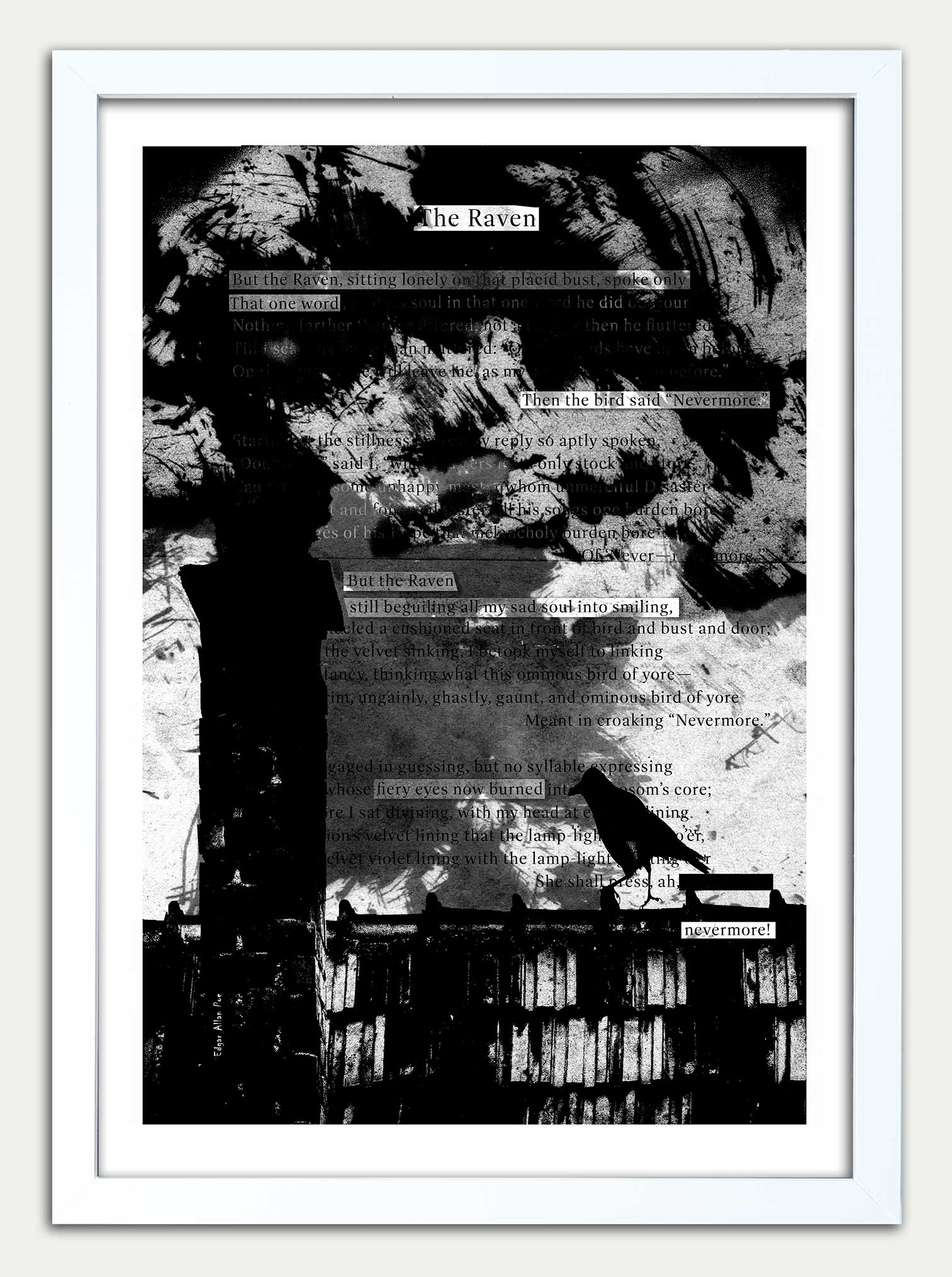 The Raven artwork by Edgar Allan Poe. Features verses 10, 11, 12, 13 from E.A.P.s seminal work The Raven. This is the 3nd print in a 4 part collection. It is designed to lead on from print 2 [The Wind and Nothing More] both in narrative and visual design.
