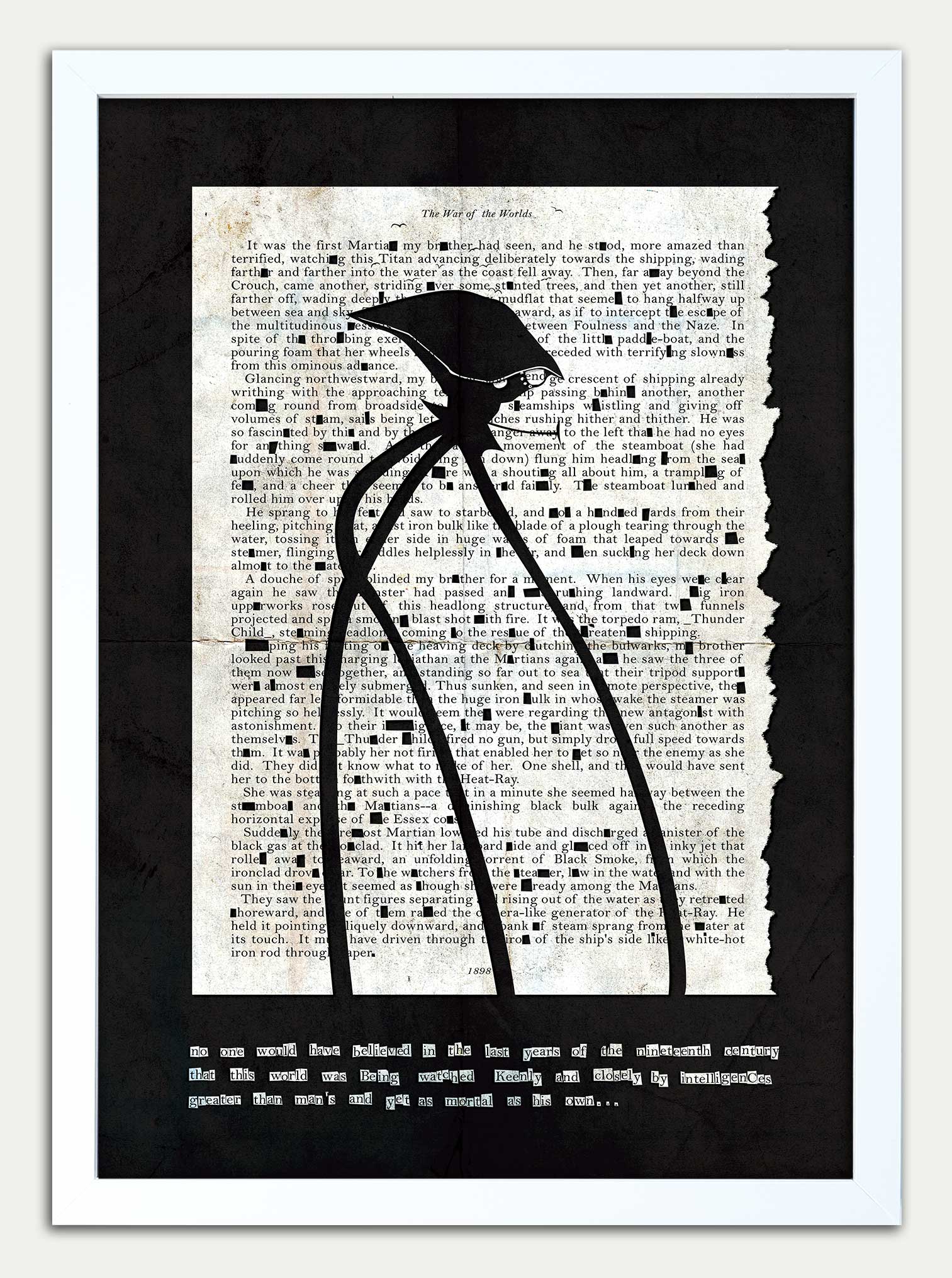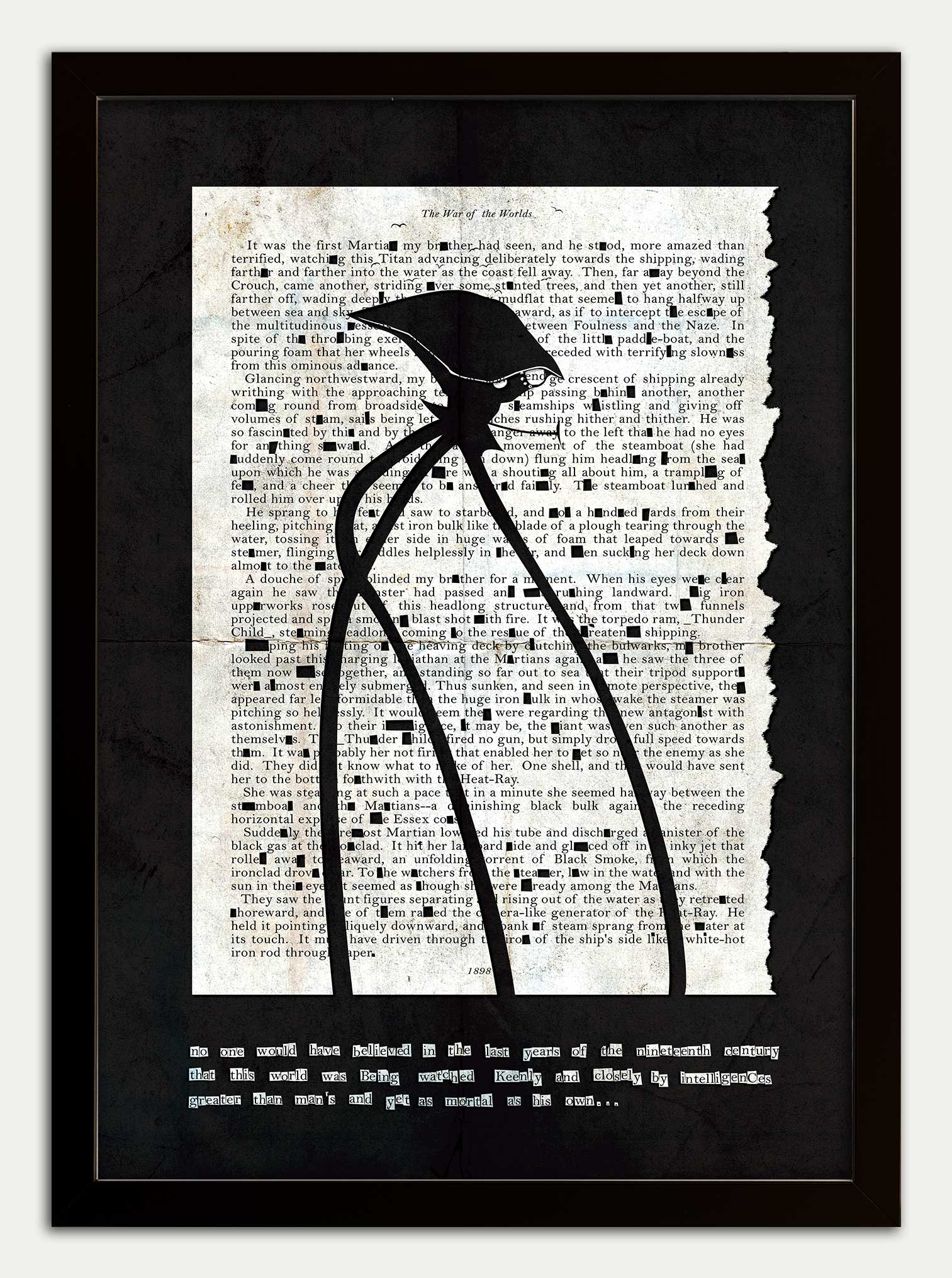 The HG Wells’ sci-fi classic, literature-inspired print. Featuring the page in which Martian Tripods descend upon escaping ships. All cut out letters stay in the same order as they were found on the page and make up the opening line: