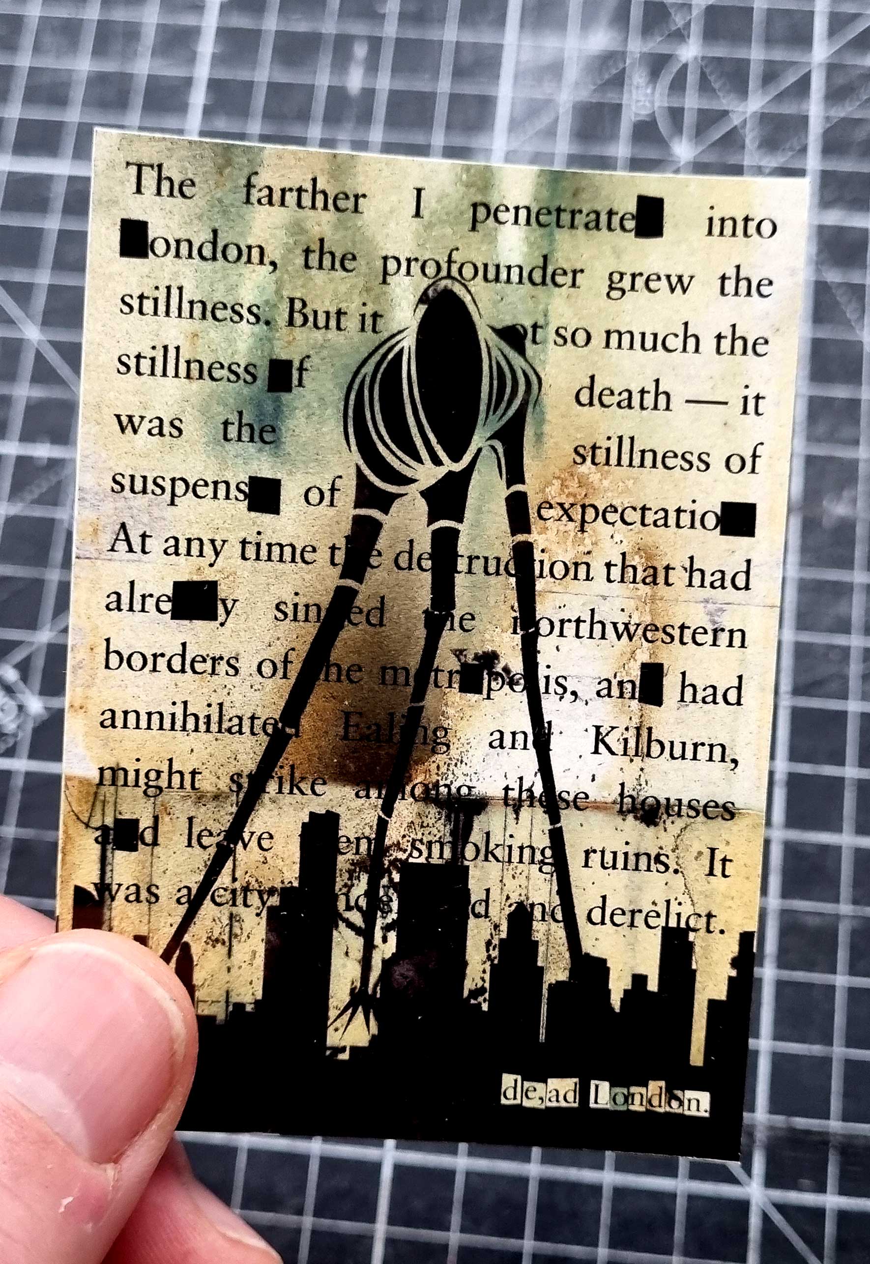 War of the Worlds chapter 8 - Dead London miniature artwork (ACEO*). A Martian tripod advances through a desolate, smoking London. Features lines from chapter 8. This is a grunge edition.