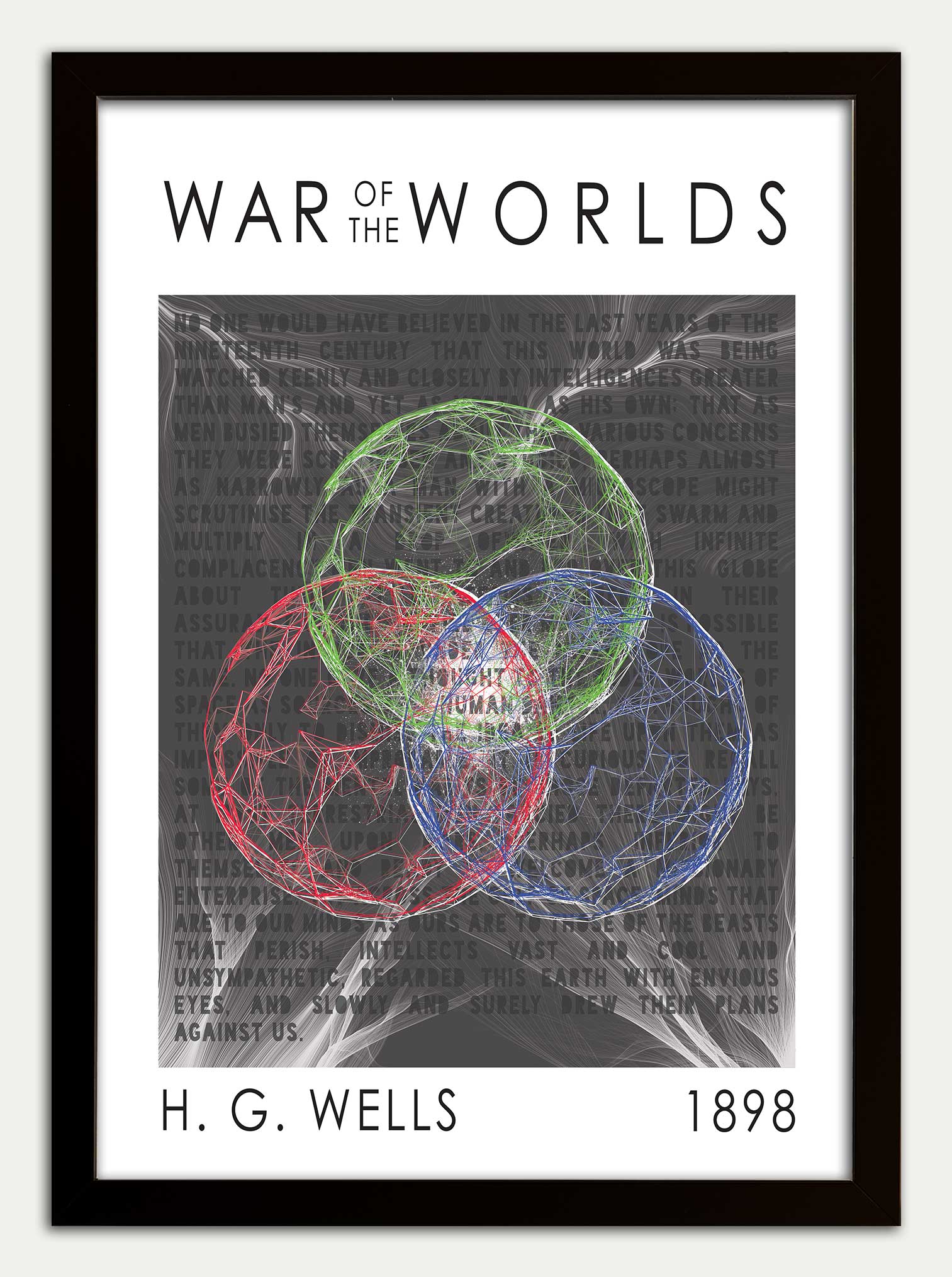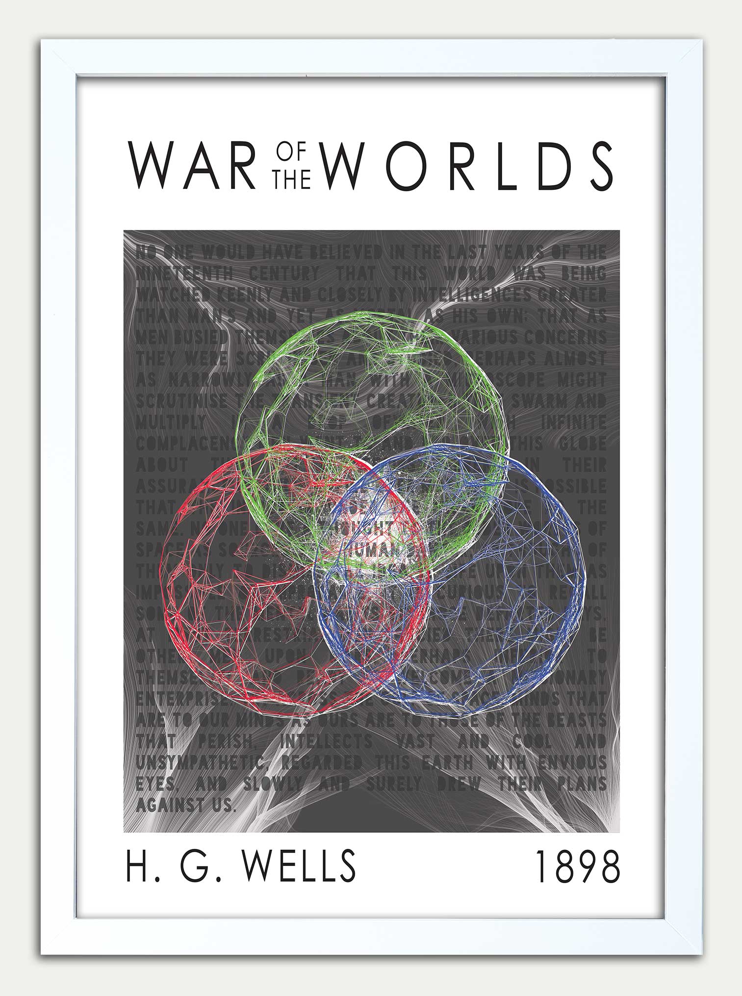 The background to my print uses the opening paragraph from Well's novel. This is packed with some of the most famous lines and features the words 'HUMAN' & 'THOUGHT'.