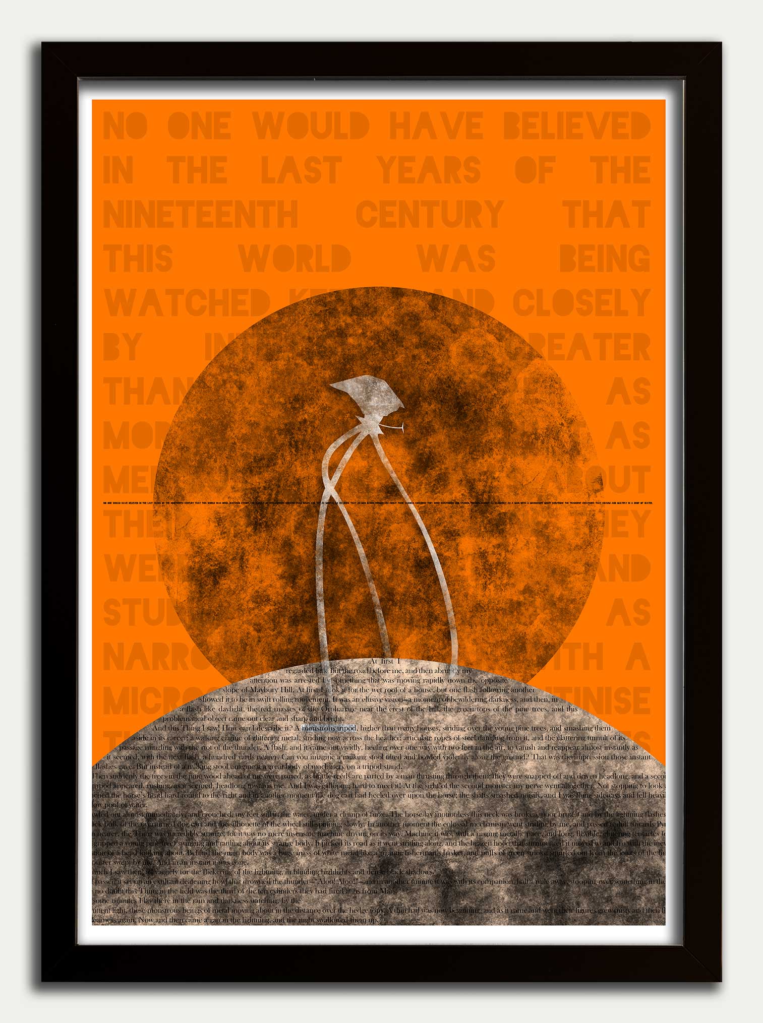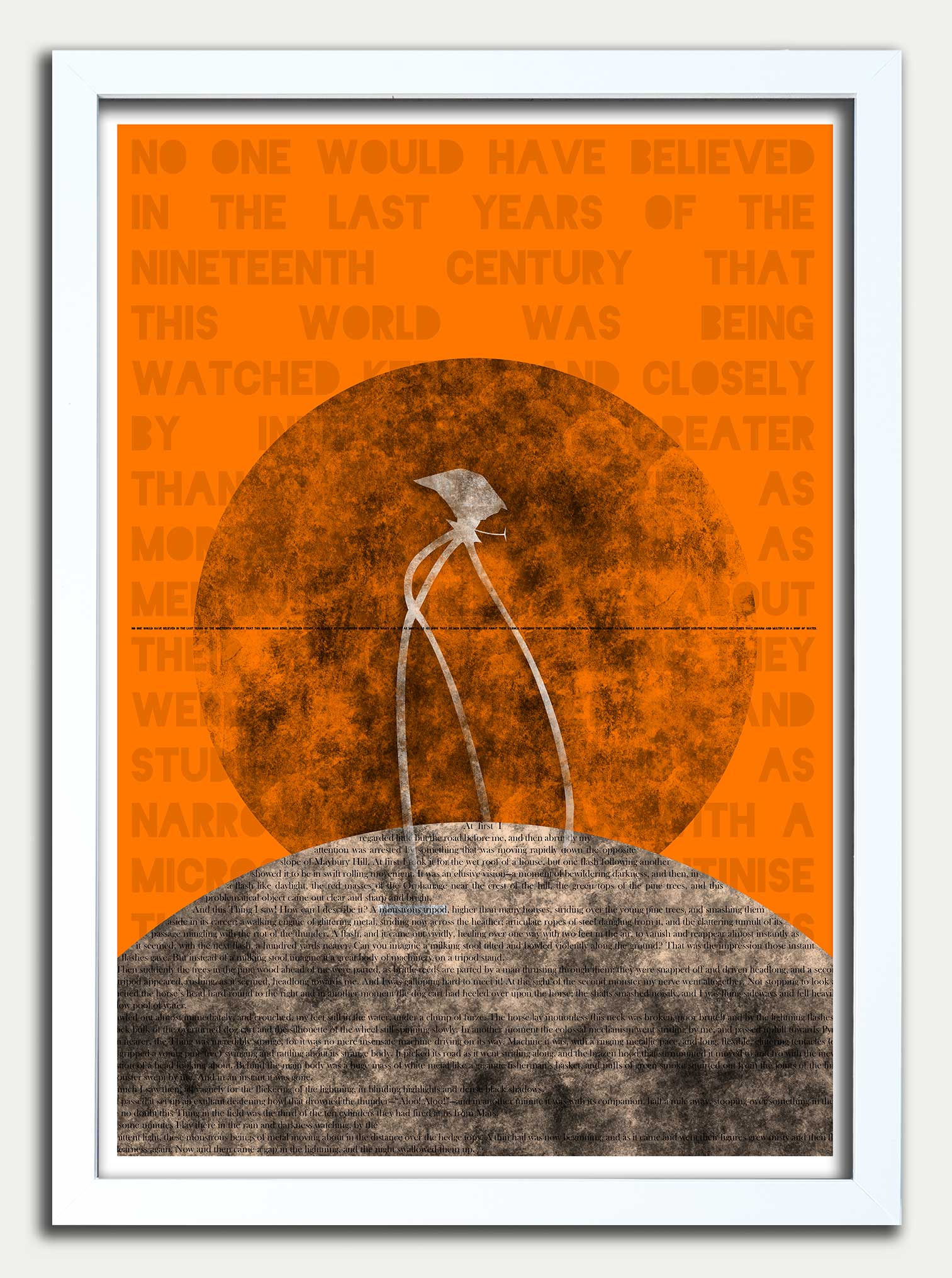 War of the Worlds fine art print. "Monstrous Tripod in Clockwork Orange" is inspired by HG Wells' seminal sci-fi classic first published in 1898. Printed in bright orange. This is the page in which the narrator - and reader - first witness the Monstrous Tripods. The opening line of the novel “No one would have believed…” can be seen in the background as well as printed in small lettering across the centre of the page.