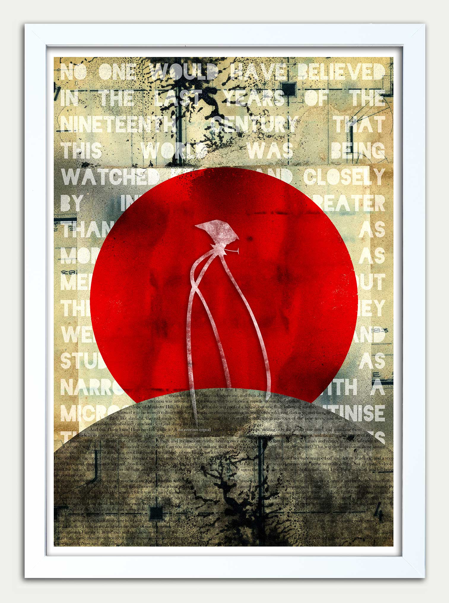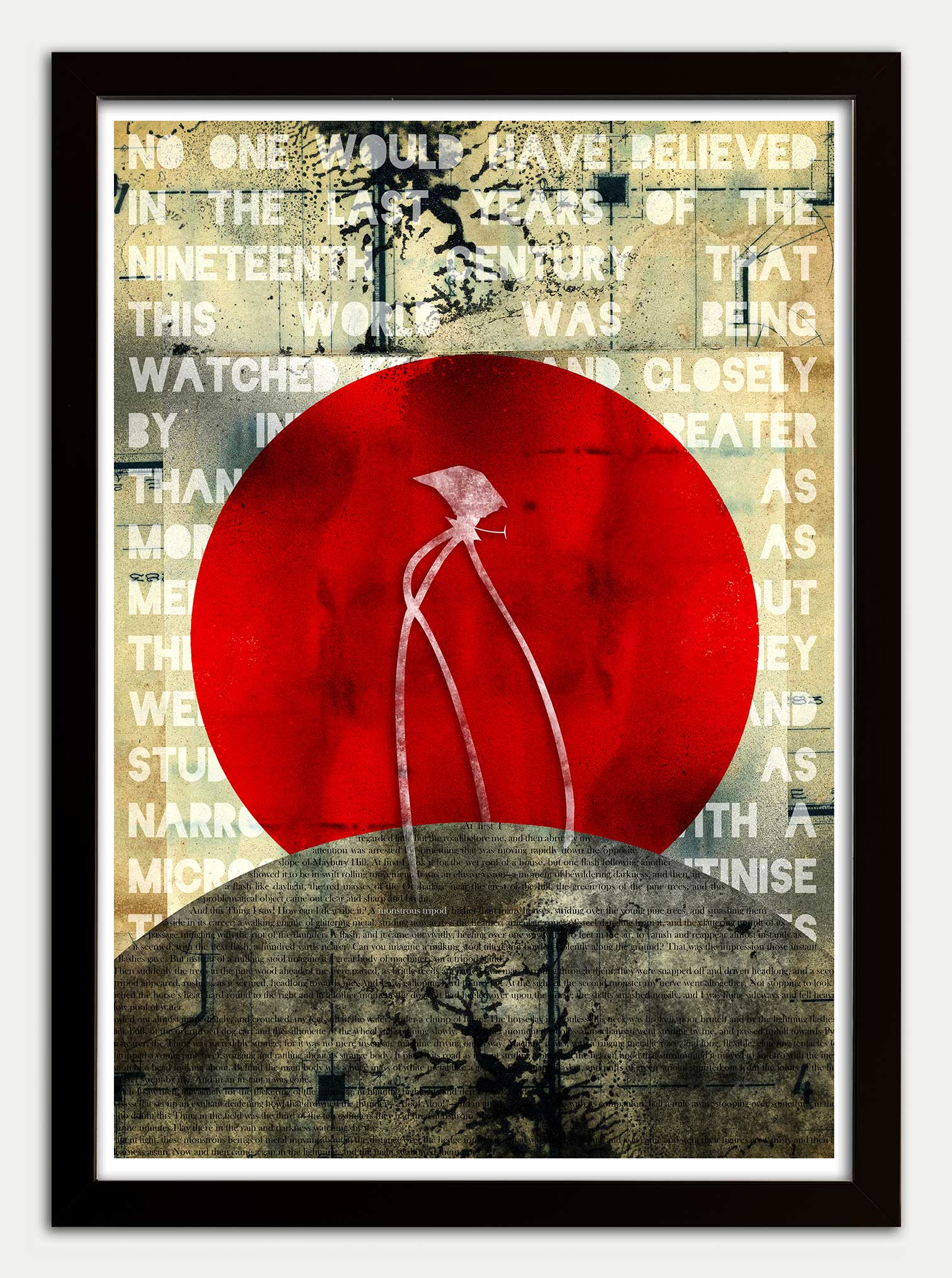 War of the Worlds fine art print. "Monstrous Tripod" SUPER GRUNGE is inspired by HG Wells' seminal sci-fi classic first published in 1898. This is the page in which the narrator - and reader - first witness the Monstrous Tripods. The opening line of the novel “No one would have believed…” can be seen in the background.