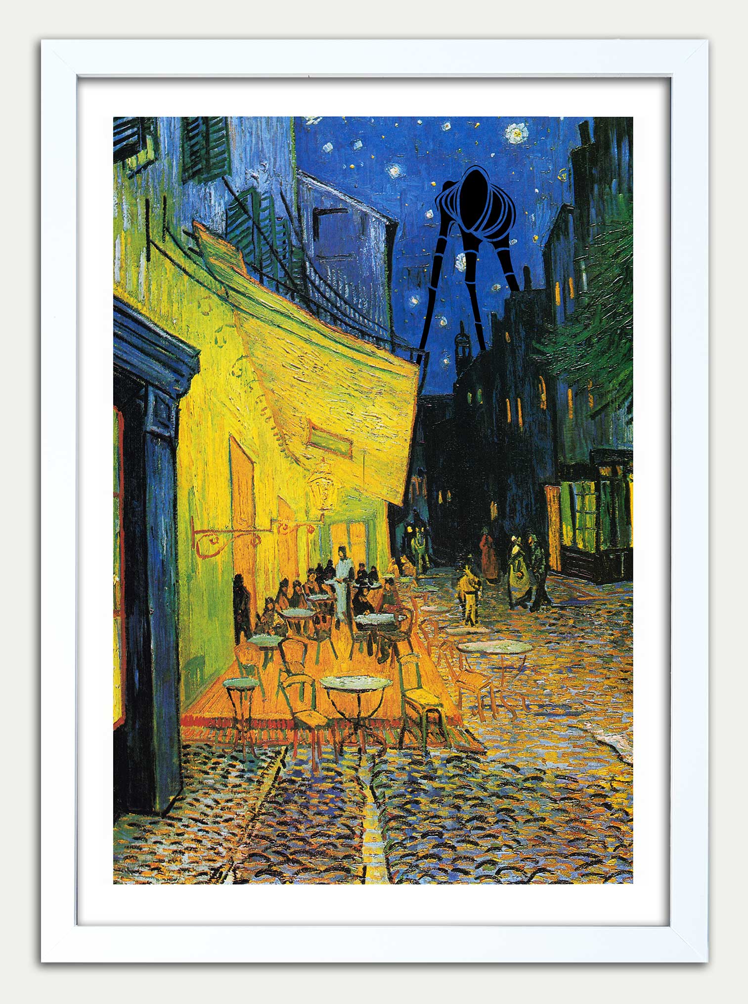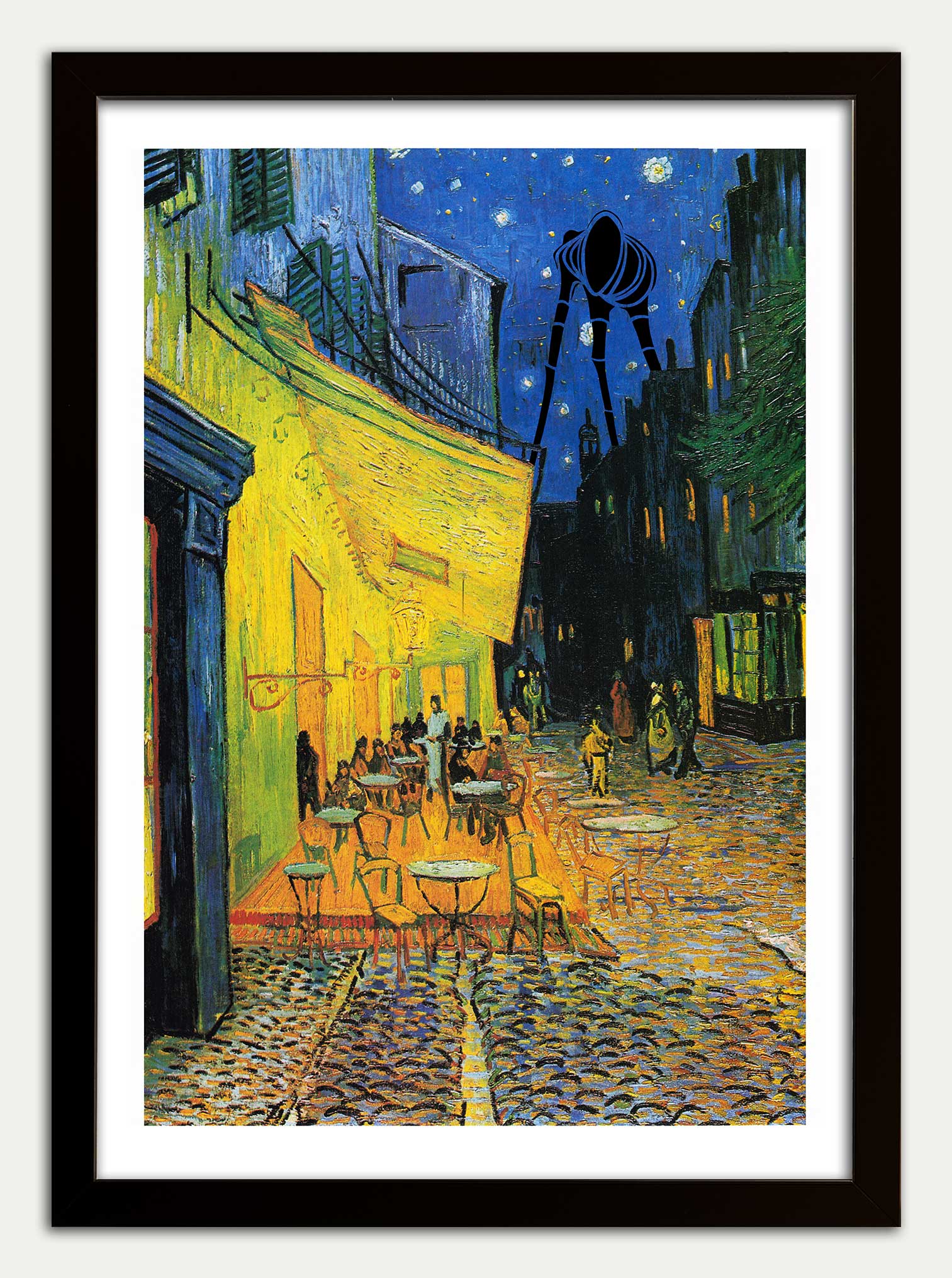 War of the Worlds meets Vincent Van Gough's Cafe Terrace at Night. The ominous silhouette of Martian Fighting Machine surveys the scene. The calm before the storm.